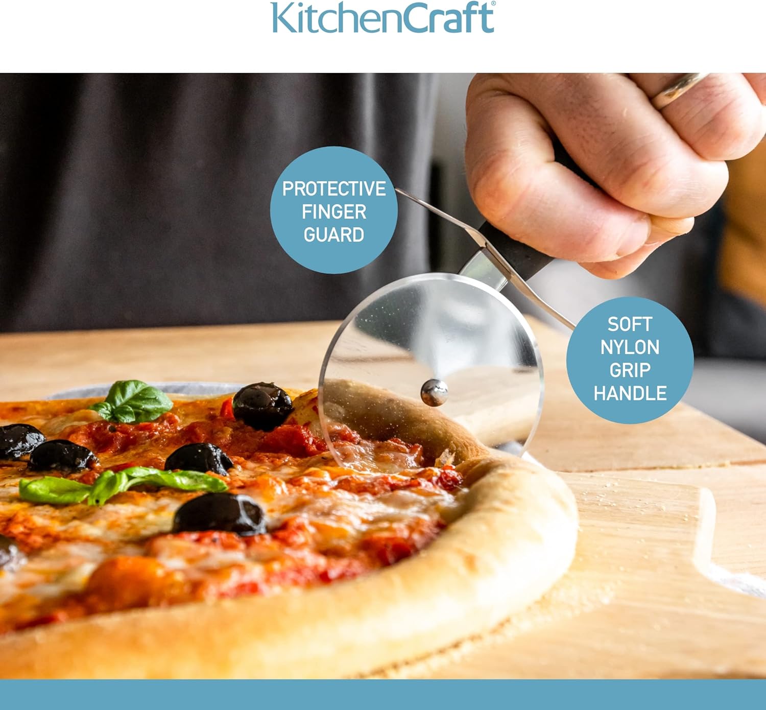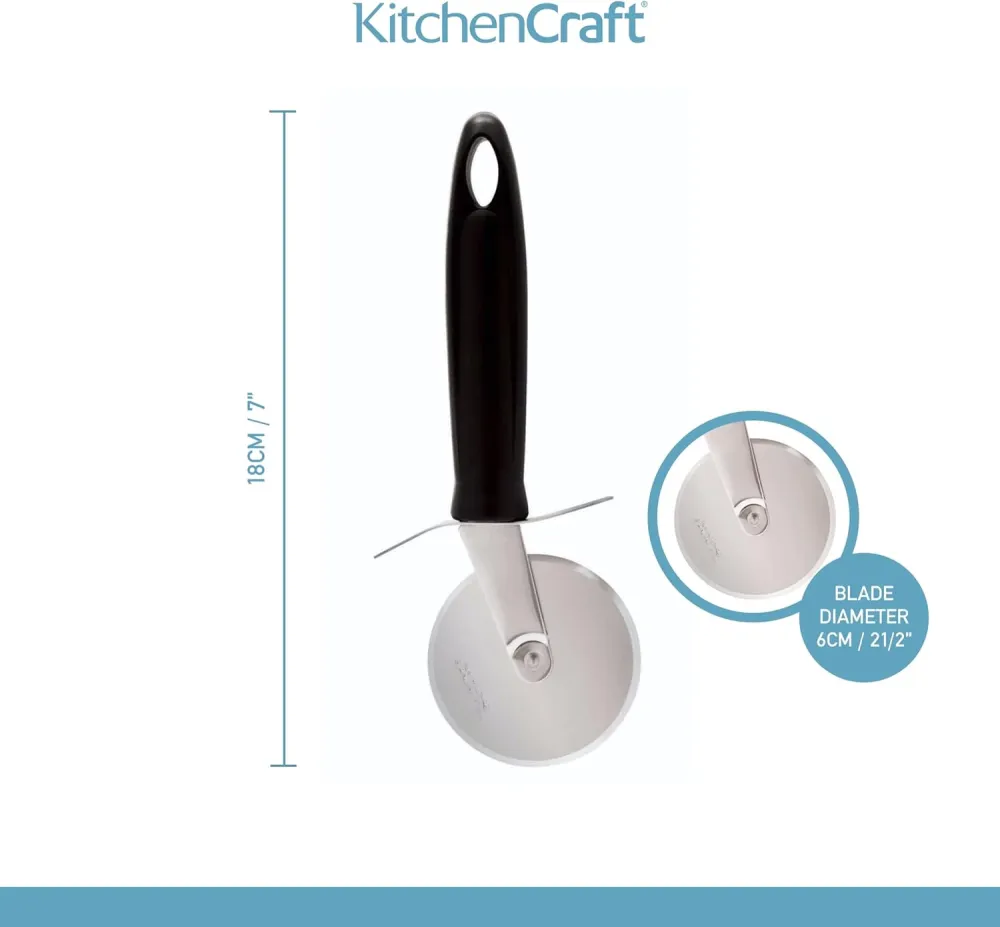 Mozzarella stuffed crust, thin and crispy Margherita, deep dish supreme - whatever your idea of pizza perfection, with KitchenCraft's Stainless Steel Pizza Cutter Wheel you can easily portion it into delicious slices! This pizza wheel has a sharp rotating blade that rolls through your pizzas, safely slicing through the thickest of crusts and toppings. It’s so much easier than using a knife, and can also be used to cut pastry sheets before baking, or portion flatbreads into shareable slices. The cutting wheel is made of stainless steel, attached to a durable nylon handle that’s designed to provide a firm, comfortable grip.Dishwasher safe.Dimensions: 28.100 x 10.000 x 2.200cm
