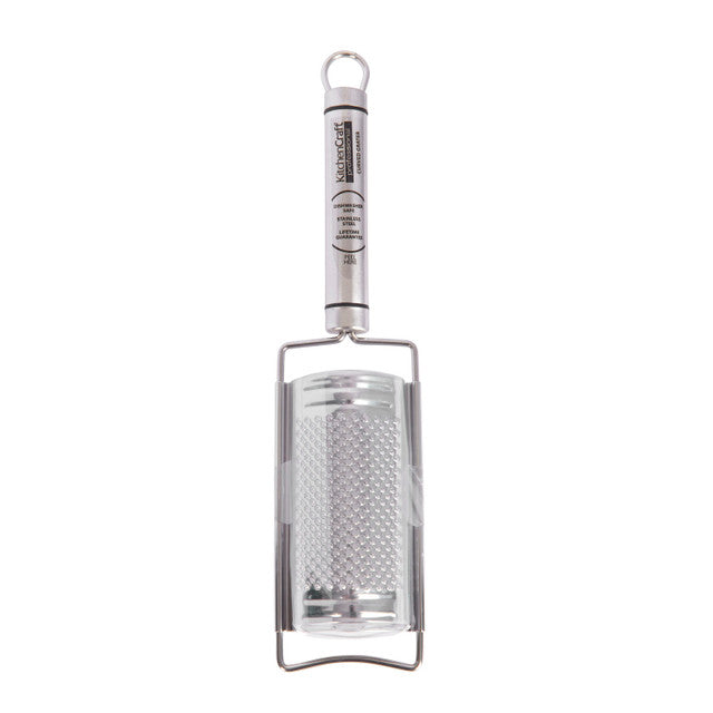 Tired of struggling with grating? This KitchenCraft Professional stainless steel grater is designed to make grating quick and easy. It's sturdy build and sharp blades effortlessly handle chocolate, cheddar, parmesan, and even nutmeg. The narrow, curved surface is perfect for zesting citrus fruits too. With a smooth handle and strong stand, it offers a secure grip for comfortable grating, horizontally or vertically. A versatile, must-have kitchen essential!Dimensions: 26 x 6 x 2.5cm