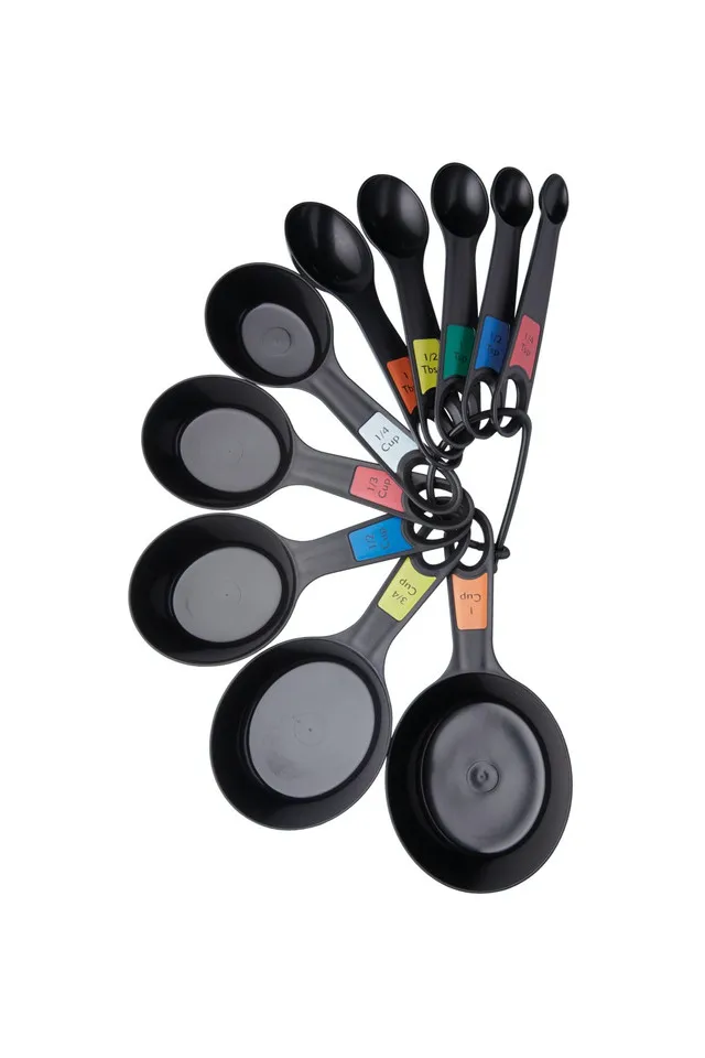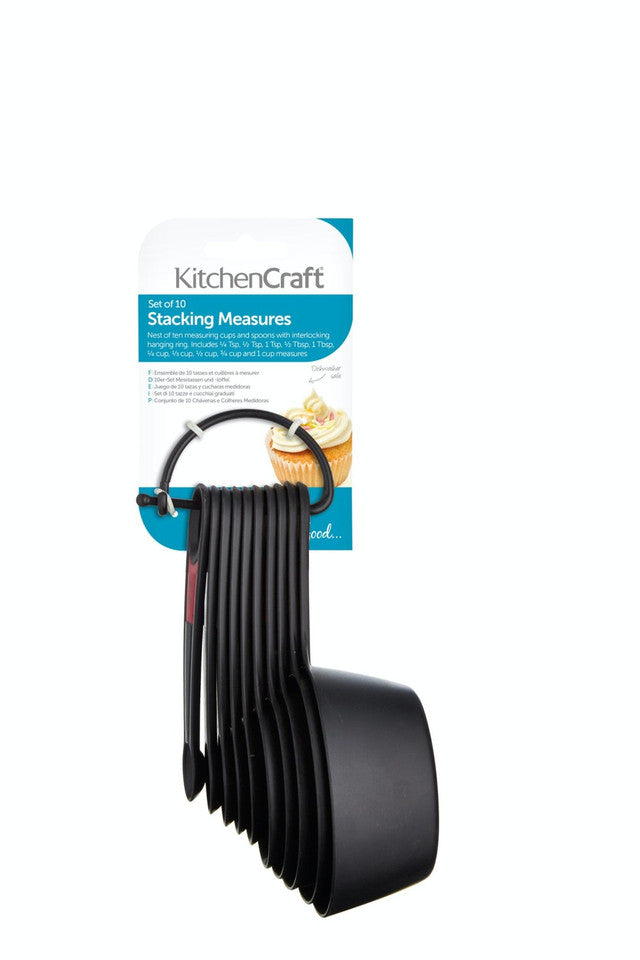 This set of ten Kitchen Craft Plastic Measuring Cups and Spoons is designed to help you bake and cook with absolute accuracy, even if you’re following American recipes! With measures ranging from ¼ teaspoon to one cup, there’s no need to carry out complicated metric-to-imperial conversions. Simply scoop up your wet or dry ingredients, and pop them straight into the mixing bowl. These cups are made of durable, lightweight black plastic.Handwash only.Dimensions: 9.000 x 30.000 x 8.500cm Product Weight in KG: 0.120 Product Weight in KG (Including Packaging): 0.140 Colour: Black Material: Plastic 12 month guarantee