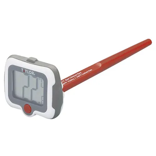 Pivoting probe allows you to read temperatures from multiple angles. Make reading the temperature of your roasted meat, fish or poultry easier with the Taylor Pro digital meat thermometer probe and its pivoting display. Take your roast from the oven and place the ultra-thin stainless steel tip into its centre. The cooking thermometer will provide an accurate core temperature reading between -40°C to 230°C (-40°F to 460°F). The large 2.5 cm (1 inch) display rests on a pivot, which can be moved to a variety of different angles for easy-reading - whether you're taking the temperature from a beef brisket or a large turkey. You don't have to worry about flavour and moisture escaping: the probe's tapered tip creates the smallest hole possible to prevent them being lost when your roast goes back in the oven. This helps to improve presentation too. Includes a five-year guarantee.Measures 17 x 2.5 x 5 cm (6½ x 1 x 2 inches) Powered by 1 x LR44 battery (included) Not designed for in-oven use Wipe clean only.Dimensions: 16.900 x 5.200 x 2.900cm Product Weight in KG: 0.029 Product Weight in KG (Including Packaging): 0.056 Colour: Silver Material: Stainless Steel Five year guarantee