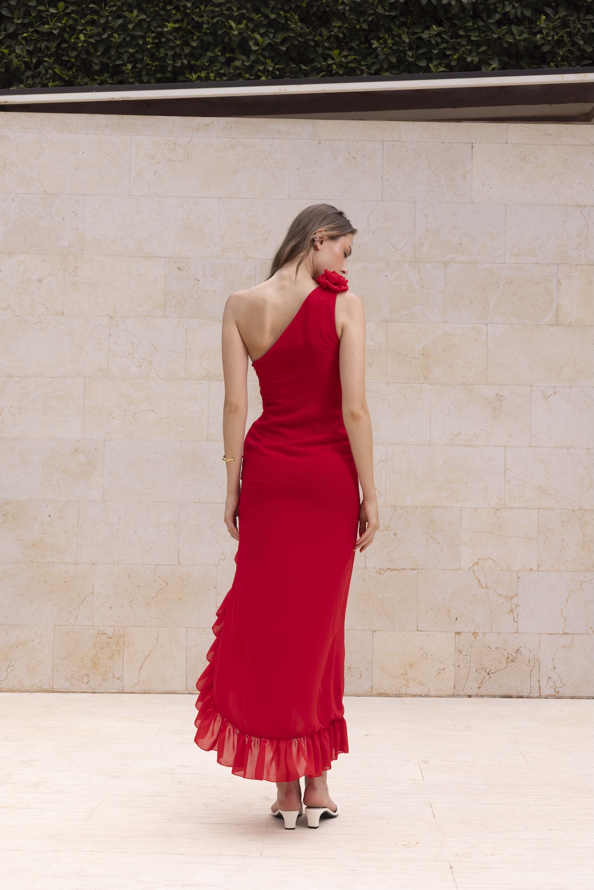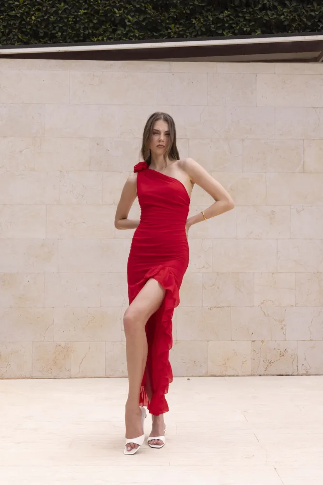 Turn heads with the Layla Dress. Layla brings the drama with its one-shoulder cut, floral detail, and ruffled slit — all in breezy muslin. Comes in hot red or earthy brown. Effortlessly feminine, made to turn heads.