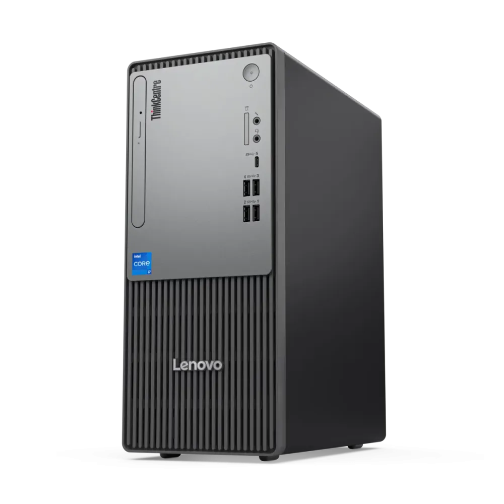 Lenovo (12UD005MGR) ThinkCentre neo 50t Gen5 Desktop Tower, i7-14700, 8Gb 512Gb SSD - Black Form Factor: Tower, 13.6L Chipset: Intel B760 Processor: Intel Core i7-14700 Up to 5.40GHz 33MbC, 20 Cores, 28 Threads Memory: 8Gb DDR5-5600 UDimm (1x 8Gb DDR5 + 1x UDimm) Storage: 512Gb SSD M.2 2280 PCIe 4.0x4 NVMe Opal 2.0 Graphics: Intel UHD 770 Integrated Optical: No ODD Card Reader: 3in1 Card Reader Ports: Front (1x USB-C 3.2 Gen1; 4x USB 3.2 Gen1; 1x 3.5mm Audio Combo Jack; 1x 3.5mm Microphone Jack) / Rear (4x USB 2.0; 1x DP 1.4a; 1x HDMI 2.1 TMDS; 1x VGA; 1x RJ-45; 1x 3.5mm Audio Jack; 1x 3.5mm Line Out) Multimedia: High Definition (HD) Audio, Realtek ALC623-CG codec, 1x 2W Speaker Keyboard: USB Calliope Keyboard, Black, US/AR Layout / USB Calliope Mouse, Black Power Supply: 180W 85% OS: No OS Warranty: 1 Year Official Warranty Color: Black Weight: 5.6kg