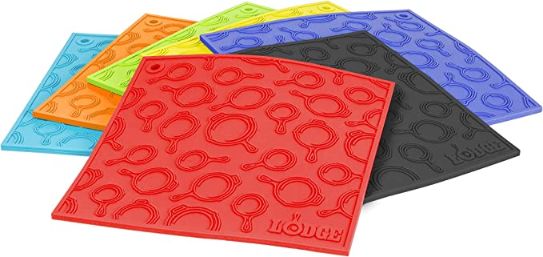 Add a snap of color to your dinner table with these silicon trivets. The 7 inch trivet features a fun skillet pattern. Protect surfaces from heat up to 525° F and hands up to 450° F.