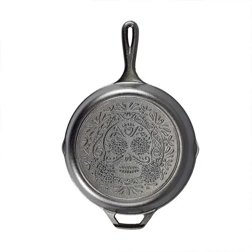 Artist Lourdes Villagómez loves the colorful sugar skulls exchanged across Mexico during Day of the Dead celebrations and wanted to create a piece of cast iron art honoring the tradition. This collectible 10.25 inch Sugar Skull cast iron skillet is a reminder to celebrate the richness of life and to hold onto stories from the past.