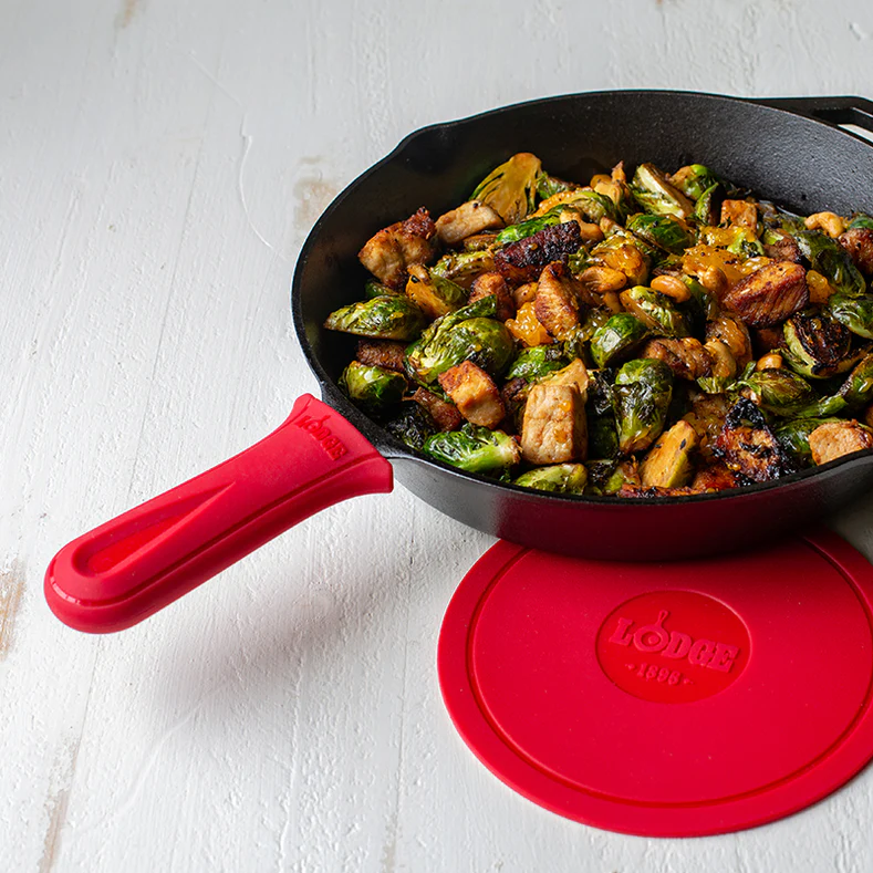 Cast iron gets hot, but this handle holder helps you transport and serve piping hot pans while protecting your hands up to 550˚F. The high-quality silicone provides a secure grip on hot cast iron so you can maneuver cookware with ease. The silicone handle holder is designed to fit snuggly on Lodge classic cast iron skillets, 9 inches and larger.