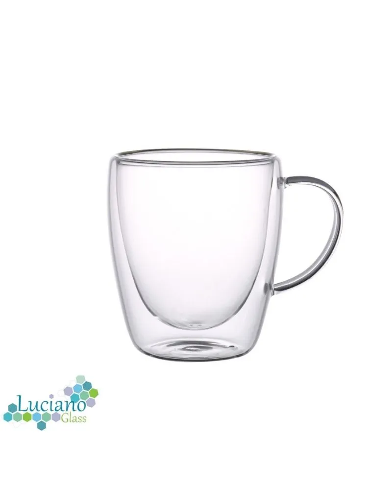 Luciano 200ml High Borosilicate / Isotherm / Double Wall Glass with Handle 2PC Set -Brand: Luciano -Heat Resistant: can go up to 250 degree Celsius -Double Wall: the internal temperature of glass content doesn't reflect on the exterior -Can go into Microwave, or oven, and also fridge -Isotherm: the temperature inside (warm or cold) is kept for a long period -Elegant Design and Feel -Light and luxurious Hold -Combination of 2 200 cups in One Color Box -Hand Made / Blown Glass This model also comes in 200ml Size. Luciano High Borosilicate Double Wall Glass Items are made in China in Luciano Glass Factories, and they are tested for safety and food security.