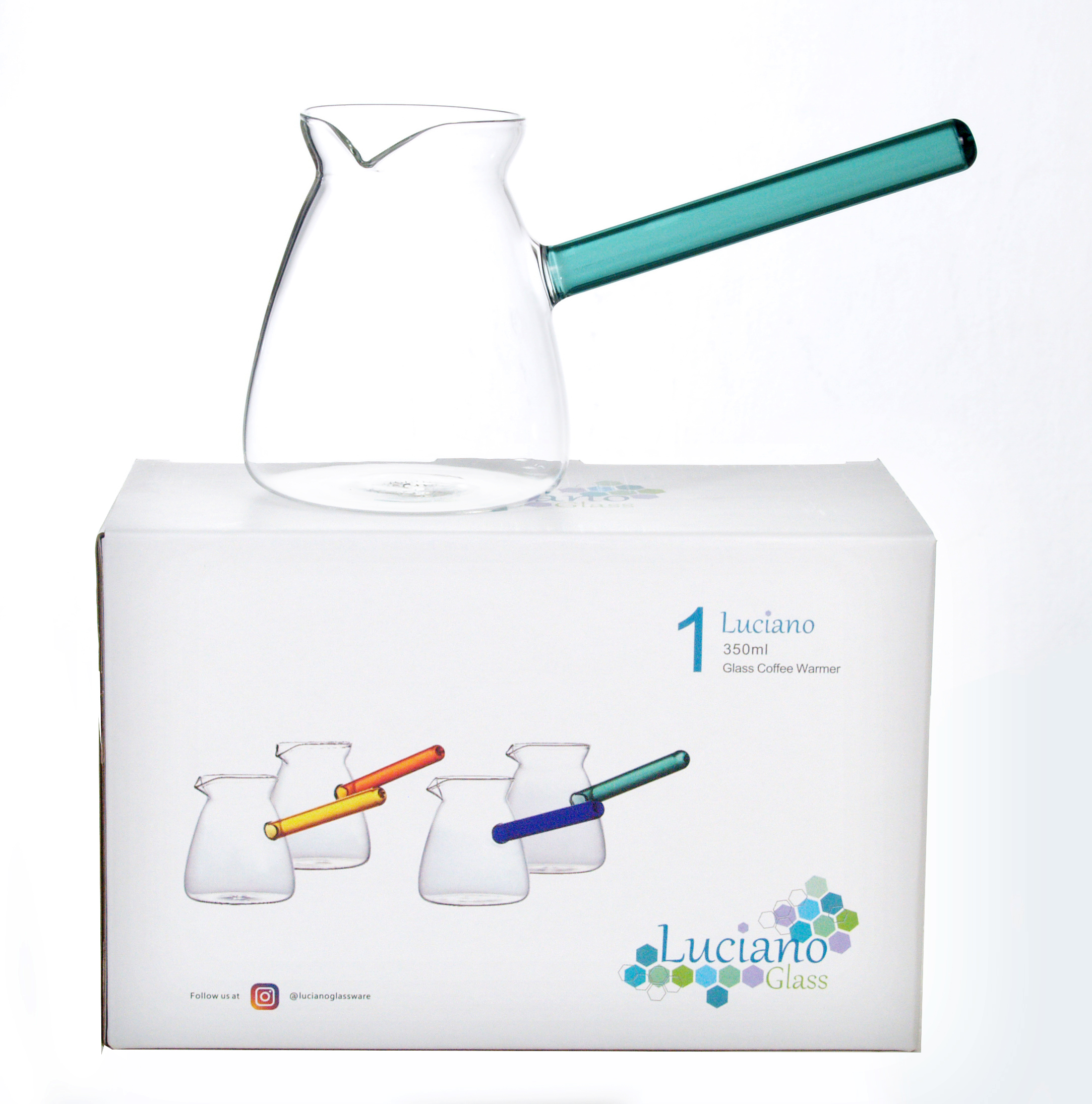 Luciano 650ml Borosilicate Green Handle Glass Coffee Warmer / Pot / Kettle / Turkish Kettle / Green Kettle / Milk Pot in Gift Box -Can be used on Gas and Electrical Heaters (Induction Adapter / Disk needed for Induction) -Green Handle Kettle / Pot -Adapted for regular use (doesn't break easily) -Elegant Design and Feel -Light and luxurious Hold -One 650ml Kettle in Color Box -Can make 6 90ml Cups -Hand Made / Blown Glass -Assorted Cups and Saucers Available Luciano High Borosilicate Single Wall Glass Items are made in China in Luciano Glass Factories, and they are tested for safety and food security.