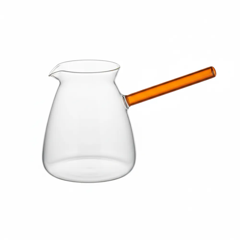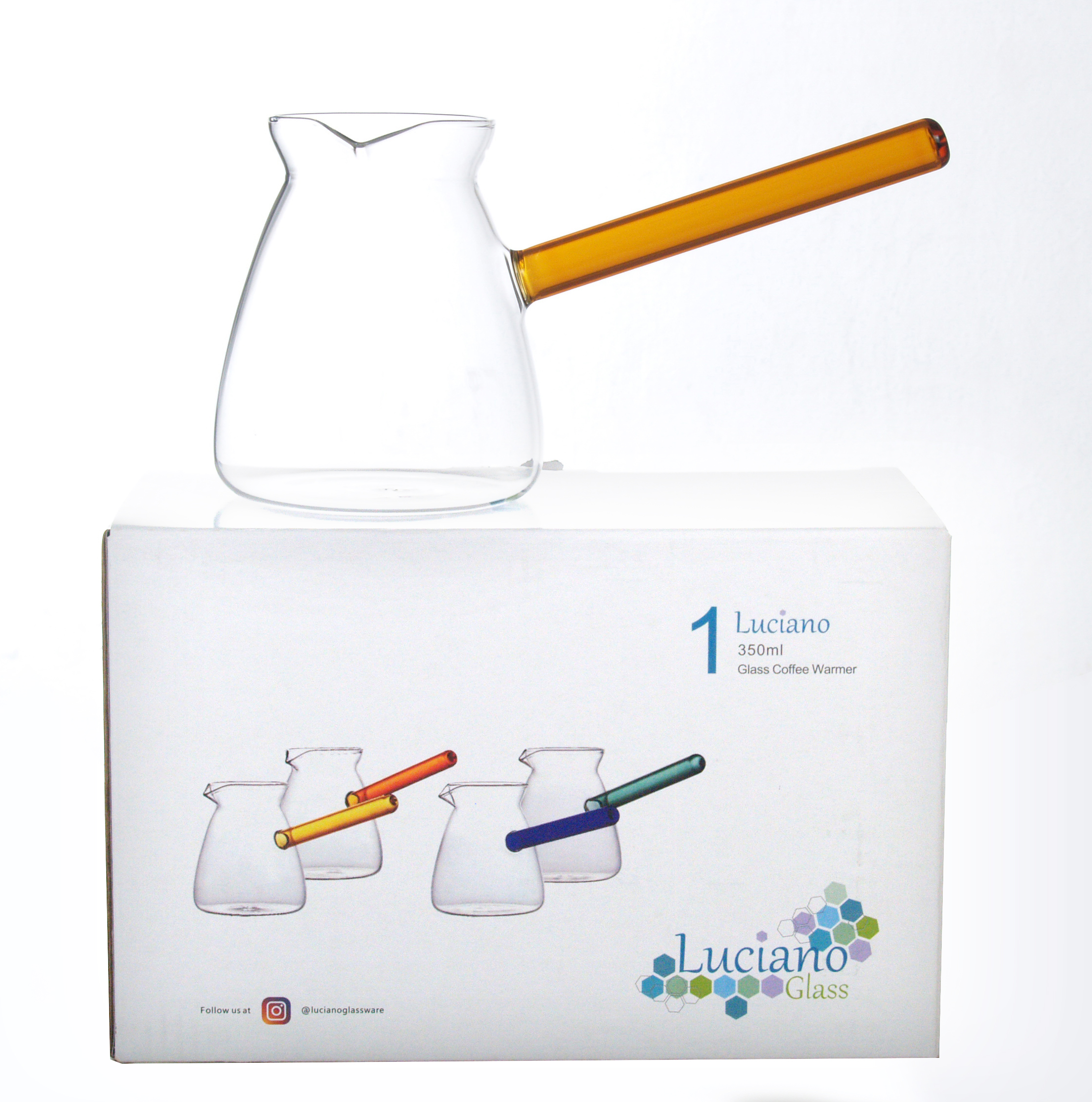 Luciano 650ml Borosilicate Red Handle Glass Coffee Warmer / Pot / Kettle / Turkish Kettle / Red Handle Kettle / Milk Pot in Gift Box -Can be used on Gas and Electrical Heaters (Induction Adapter / Disk needed for Induction) -Amber Handle Kettle / Pot -Adapted for regular use (doesn't break easily) -Elegant Design and Feel -Light and luxurious Hold -One 650ml Kettle in Color Box -Can make 6 90ml Cups -Hand Made / Blown Glass -Assorted Cups and Saucers Available Luciano High Borosilicate Single Wall Glass Items are made in China in Luciano Glass Factories, and they are tested for safety and food security.