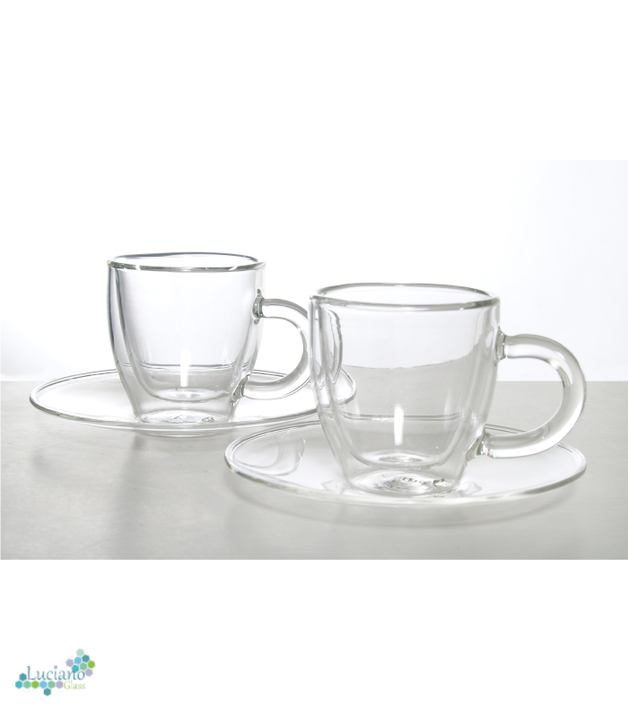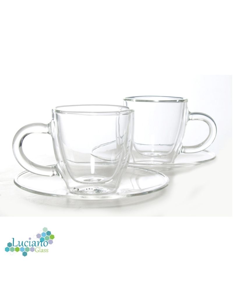 Luciano 70Ml Borosilicate / Isotherm / Double Wall Coffee Glass Cup and Saucer Set (2 cups, 4 pieces set) -4 pieces Set: 2 cups and 2 saucers -Transparent Cup Handles -Brand: Luciano -Heat Resistant: can go up to 250 degree Celsius -Double Wall: the internal temperature of glass content doesn't reflect on the exterior -Can go into microwave, or oven, and also fridge -Isotherm: the temperature inside (warm or cold) is kept for a long period -Elegant Design and Feel -Light and luxurious Hold -Combination of 2 70ml cups with handle and 2 assorted 11 cm saucers in One Color Box -Hand Made / Blown Glass Luciano High Borosilicate Single and Double Wall Glass Items are made in China in Luciano Glass Factories, and they are tested for safety and food security.