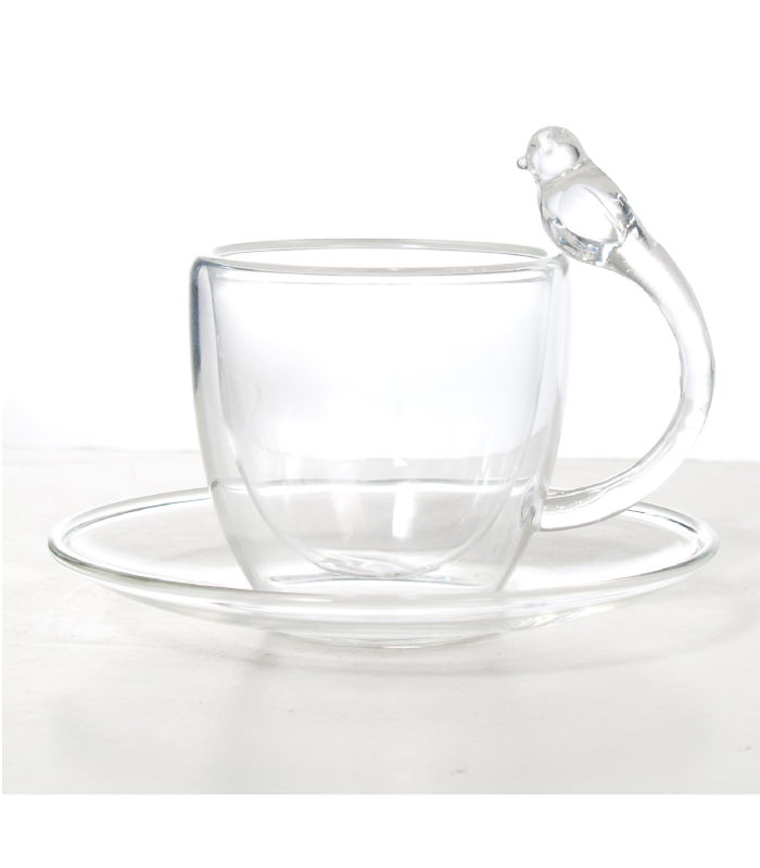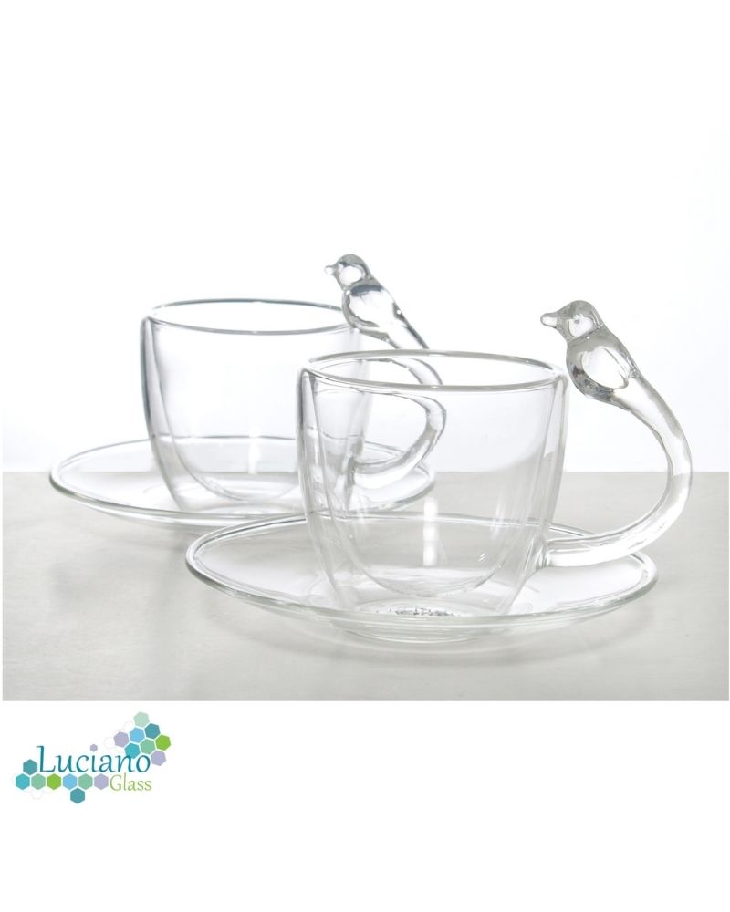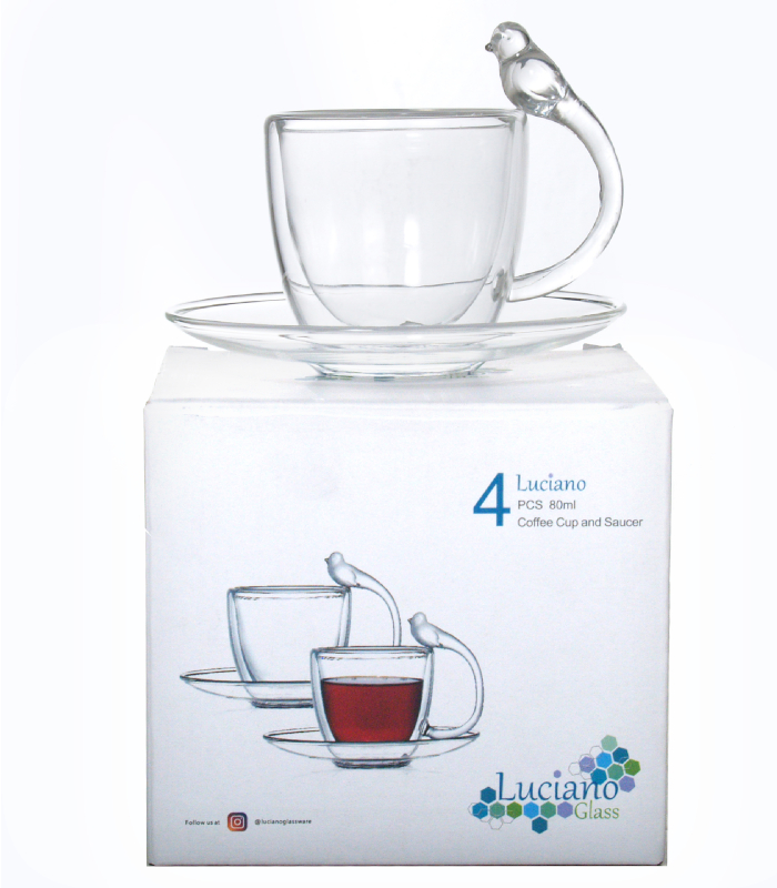 Luciano 80Ml High Borosilicate / Isotherm / Double Wall Espresso Glass Cup and Saucer (Cup with Bird Figurine Handle) Set -4 pieces Set: 2 cups and 2 saucers -Transparent Cup with Bird Figurine Handles -Brand: Luciano -Heat Resistant: can go up to 250 degree Celsius -Double Wall: the internal temperature of glass content doesn't reflect on the exterior -Can go into Dishwasher, microwave, or oven, and also fridge -Isotherm: the temperature inside (warm or cold) is kept for a long period -Elegant Design and Feel -Light and luxurious Hold -Combination of 2 80ml cups with handle and 2 assorted 11 cm saucers in One Color Box -Hand Made / Blown Glass Luciano 70Ml Borosilicate / Isotherm / Double Wall Coffee Glass Cup and Saucer Set (2 cups, 4 pieces set) -4 pieces Set: 2 cups and 2 saucers -Transparent Cup Handles -Brand: Luciano -Heat Resistant: can go up to 250 degree Celsius -Double Wall: the internal temperature of glass content doesn't reflect on the exterior -Can go into Dishwasher, microwave, or oven, and also fridge -Isotherm: the temperature inside (warm or cold) is kept for a long period -Elegant Design and Feel -Light and luxurious Hold -Combination of 2 80ml cups with handle and 2 assorted 10 cm saucers in One Color Box -Hand Made / Blown Glass Luciano High Borosilicate Single and Double Wall Glass Items are made in China in Luciano Glass Factories, and they are tested for safety and food security.