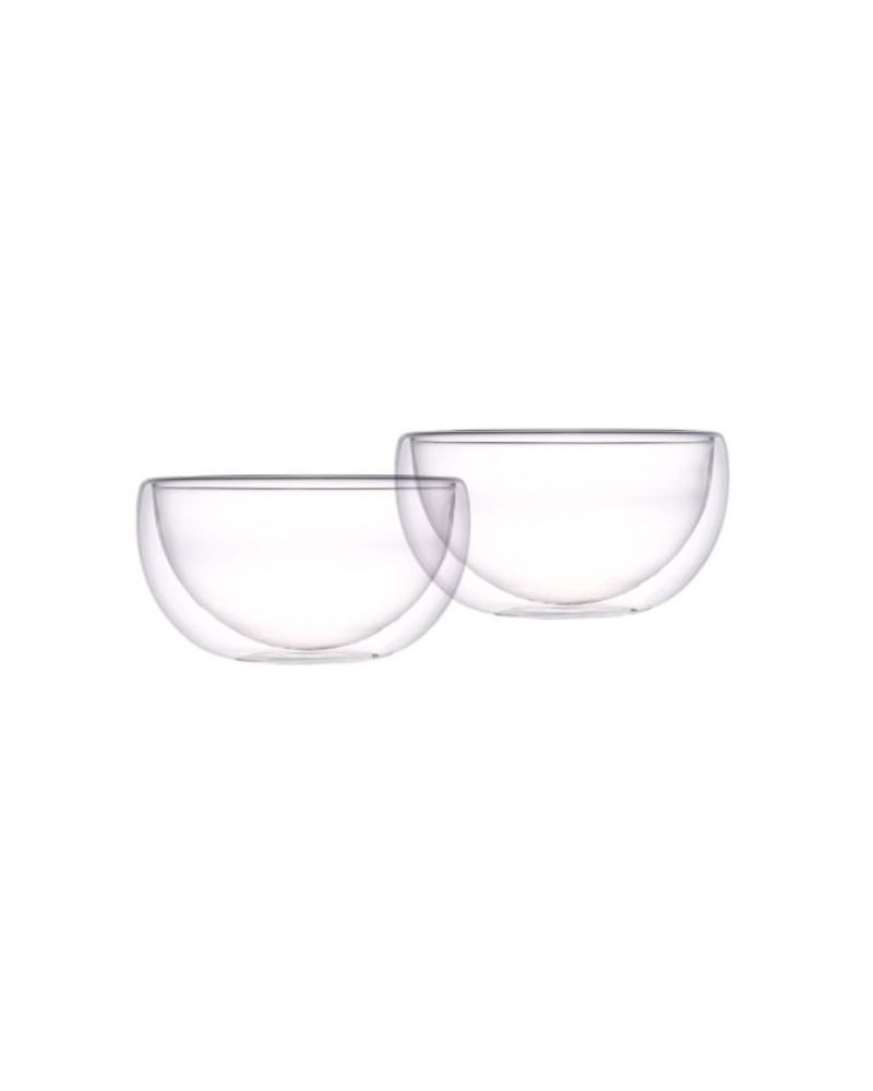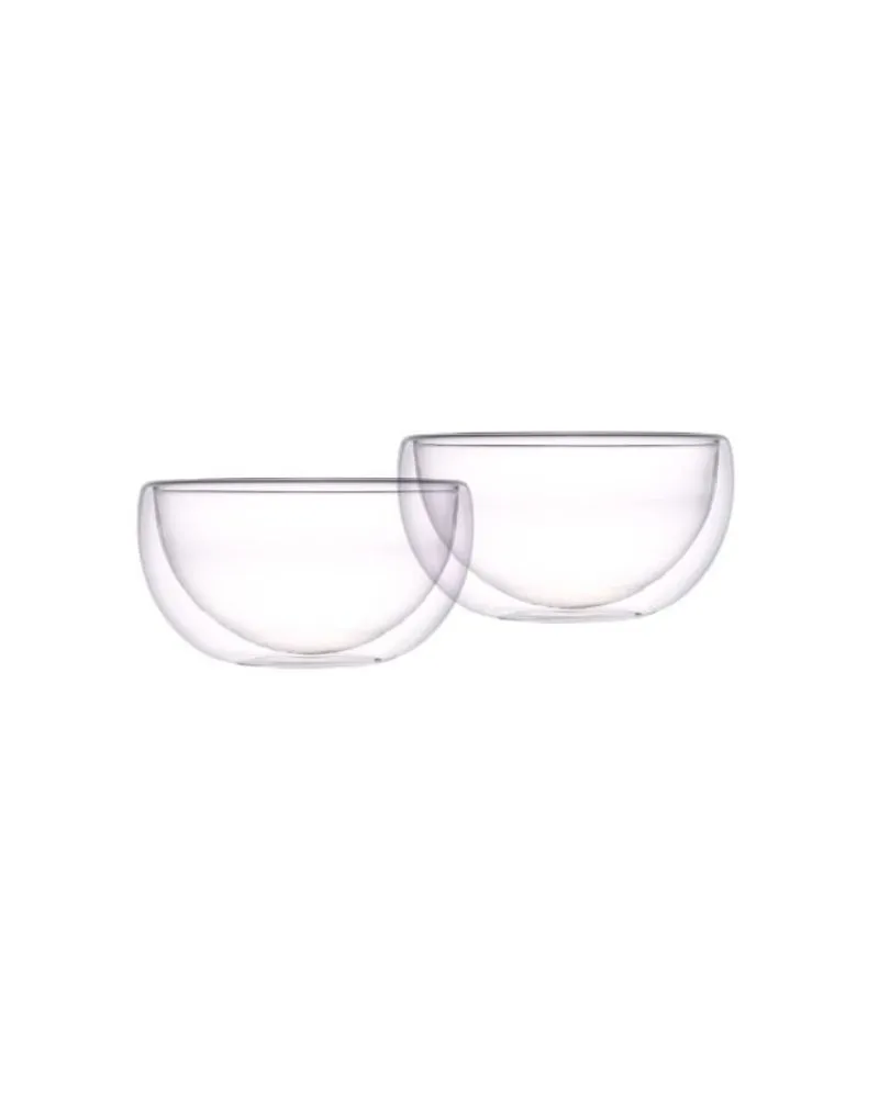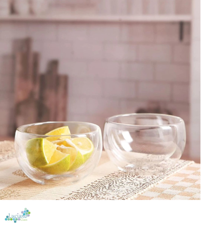 Luciano High Borosilicate Double Wall Glass Bowl Set This set of Isotherm Double Wall Glass Bowls is composed of 2 500ml cups without handles. They come in a gift box and are not only elegant, but they are also light and when you use them once, you feel like you cannot use normal glass anymore. They are hand-made and special attention is taken to details and a special quality control is made to make sure items are conform to standards. They are ideal for fruit salad or for other deserts and even for soup. Double Wall Glass Cups help keep the temperature of the liquid inside. They are called Isotherm. The outer wall in contact with your hand remains at room temperature, while the internal wall and the space between two walls keep the temperature of the liquid inside whether cold or hot. High Borosilicate glass is extremely resistant to hot and cold temperatures. This is why these cups are especially convenient for hot or very cold mixtures, coffee, tea, espresso, for hot or cocktails and shots for cold. It's preferable that all double wall glass items are not washed in dishwashers. Luciano High Borosilicate Double Wall Glass Items are made in China in Luciano Glass Factories, and they are tested for safety and food security.