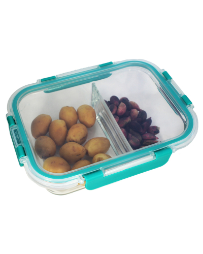 $NaNLuciano High borosilicate Rect. 2 Compartment glass container with lifetime lasting lid 1040ml (19.6x14.6x6cm) -Borosilicate Containers that can handle hot and very cold liquids passing from cold to hot without any problem -Luciano Borosilicate airtight containers can be held in any position without splitting any inside content. They can be used to store content in the fridge or to cook or to warm food after taking it out from the fridge