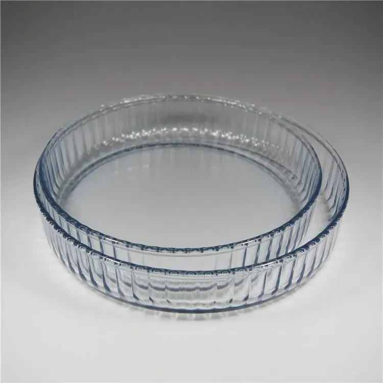 Luciano High Borosilicate Round Glass Pans 2PC Set This set of Glass Pizza Pans is composed of 2 items. The Glass Pans are made of High Borosilicate Glass, which means they can be used in the oven, on gas, in microwave, as well as put in the freezer or fridge. Because of their elegant design and finishing, they can also be used on table or for presenting foods. These pans are thus extremely useful because they can be used to cook, and then to store the remaining items in the fridge or in the freezer. They are also dishwasher safe. Luciano Glass Pizza Pans can also be used to prepare tarts, cakes, knefeh, etc. The round glass containers can be stored inside each other for minimum space usage and practical storage. Containers sizes are 27.7x3.5cm and 30.8x3.5cm These glass bakeware pans are made in China in Luciano Glass Factories