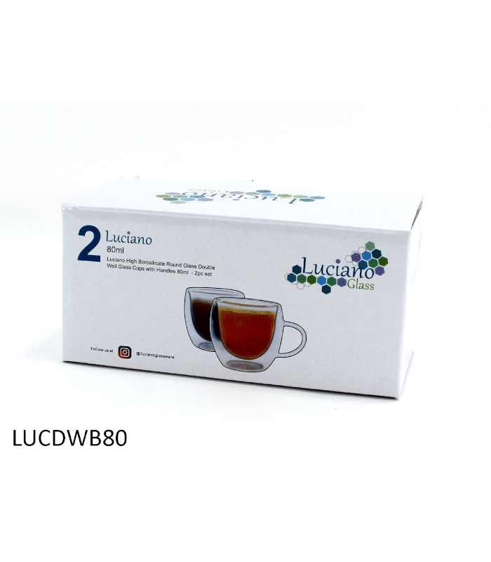 Luciano High Borosilicate Double Wall Glass Espresso Set This set of Isotherm Double Wall Glass Cups is composed of 2 80ml cups with handles. They come in a gift box and are not only elegant, but they also light and when you use them once, you feel like you cannot use normal glass anymore. Double Wall Glass Cups help keep the temperature of the liquid inside. They are called Isotherm. The outer wall in contact with your hand remains at room temperature, while the internal wall and the space between two walls keep the temperature of the liquid inside whether cold or hot. High Borosilicate glass is extremely resistant to hot and cold temperatures. This is why these cups are especially convenient for hot or very cold mixtures, coffee, tea, espresso, for hot or cocktails and shots for cold. Other sizes of this shape are 250ml and 350ml, and there also similar shapes without handles of 80ml, 250ml and 350ml. It's preferable that all double wall glass items are not washed in dishwashers. Luciano High Borosilicate Double Wall Glass Items are made in China in Luciano Glass Factories, and they are tested for safety and food security.