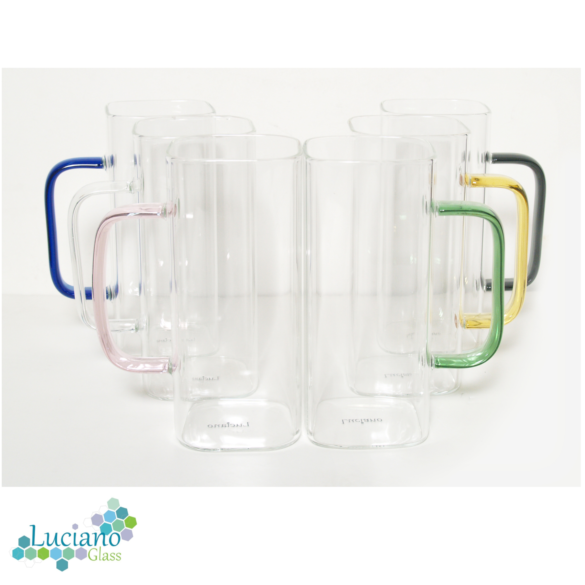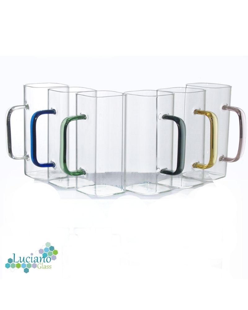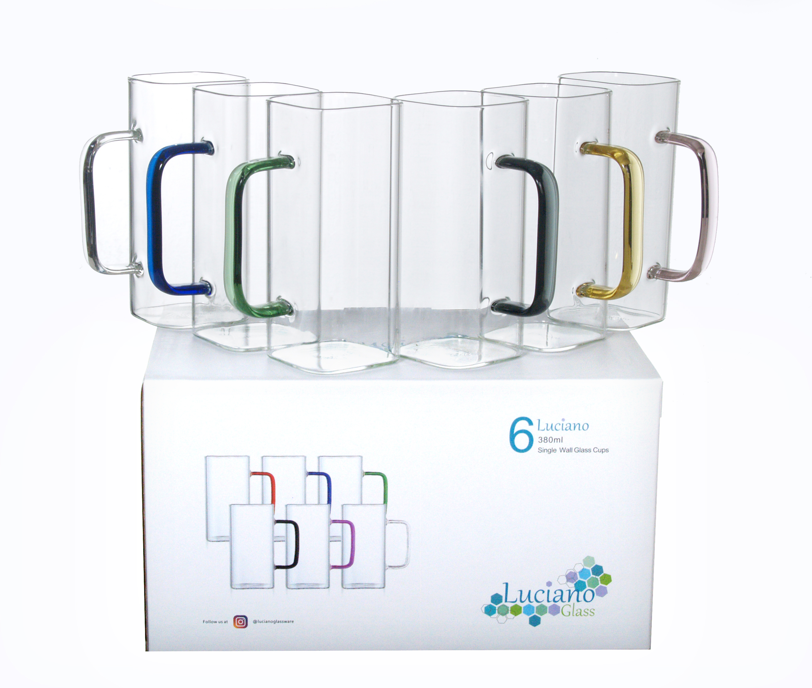 Luciano 380Ml High Borosilicate Single Wall Glass Cup 6Pcs Set with Color Handles -Beautiful and Unique Square Shape -Brand: Luciano -Heat Resistant: can go up to 250 degree Celsius -Elegant Design and Feel -Mixed Colors Handles -Light and luxurious Hold -Resistant because of Borosilicate Nature of Glass -Combination of 6 380ml cups with color handles in One Color Box -Hand Made / Blown Glass Luciano High Borosilicate Single Wall Glass Items are made in China in Luciano Glass Factories, and they are tested for safety and food security.