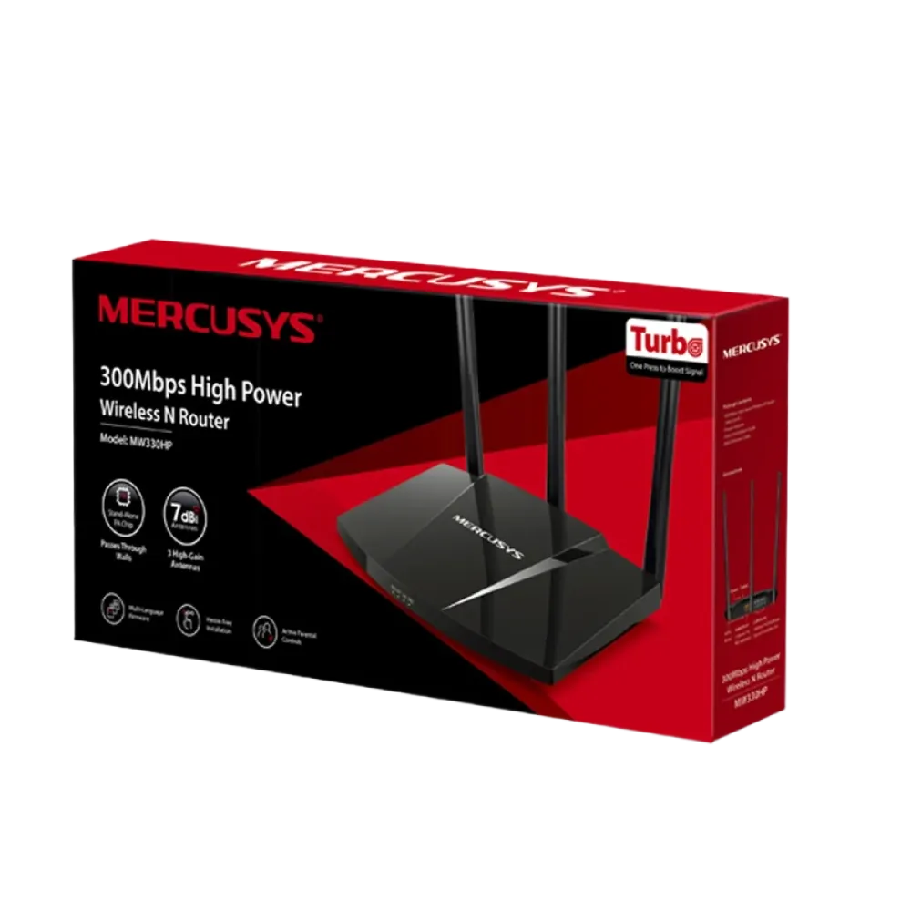 $NaNMercusys by TP-Link (MW330HP) 300Mbps High Power Wireless N Router - Multimode - Black Wireless Standards: IEEE 802.11b/g/n Frequency: 2.402-2.482GHz Wireless Security: WPA-PSK / WPA2-PSK Interfaces: 3x 10/100Mbps LAN Ports; 1x 10/100Mbps WAN Port External Power Supply: 9V/0.6A