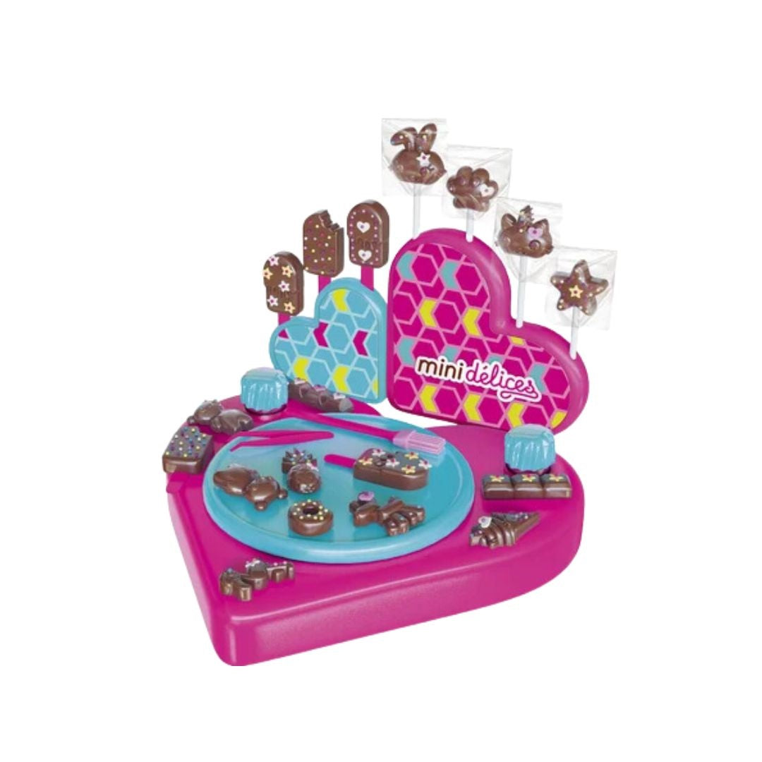 The Mini Delices - Atelier Chocolat 5 En 1 allows children to easily create five types of chocolate treats, including marshmallow bears, lollipops, and chocolate bars. Please note that chocolate is not included.