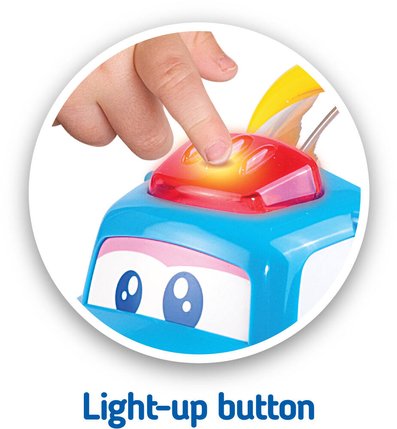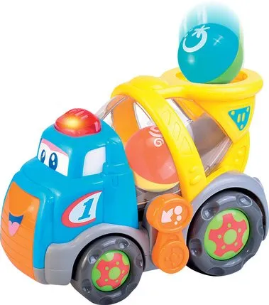 Press the light-up button to activate the lights and sounds. Place the balls in the truck and watch them continue to spin as you roll the truck forward. Lower the lever to launch the balls out of the truck's mouth.