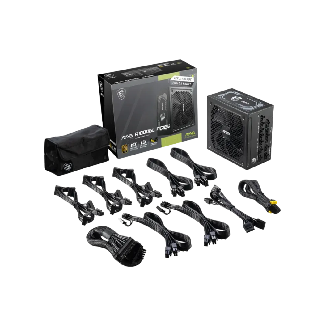 MSI (MAG A1000GL) PCIe5 Power supply 1000W - 80 Plus Gold - Black Modular: Fully Modular Fan Size: 135mm PFC Type: Active PFC Features: 1x ATX 24Pin; 2x EPS (4+4Pin); 1x PCI-E 5.0 (16Pin); 4x PCI-E (6+2Pin); 12x SATA (15Pin); 4x Molex (4Pin); 1x FDD (4Pin) Protection: OCP / OVP / OPP / OTP / SCP / UVP Warranty: 2 Years Official Warranty