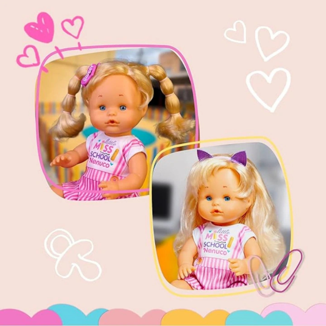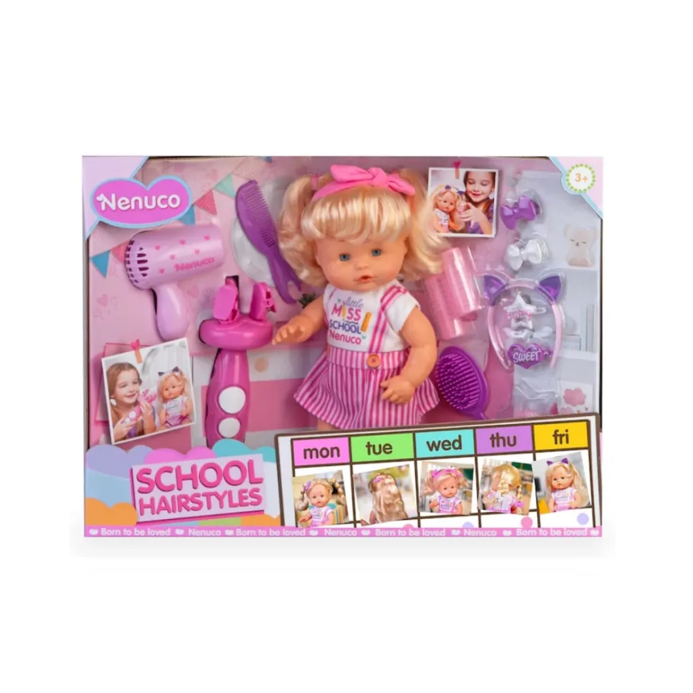 Meet Nenuco Hairstyles, a charming 35 cm doll with a hard body and long blonde hair, perfect for daily hairstyle fun.