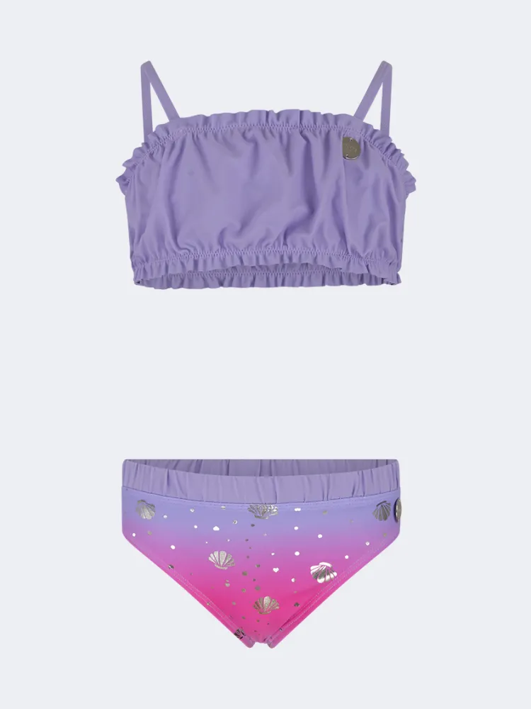 Splashy shades and sporty comfort team up in Oil?&?Gaz’s color-burst bikini set for girls. The two-piece pairs a secure, high-neck crop top with a stay-put racer-back and a matching mid-rise brief—both cut from buttery recycled micro-jersey that stretches four ways and dries almost instantly. Bold panels of orchid-purple and bubble-gum pink meet in a diagonal color-block that pops against blue water, while contrast binding traces every edge for extra strength. Fully lined to prevent show-through, the suit features flat-lock seams so there’s nothing scratchy to distract from sandcastle marathons or swim-team drills.