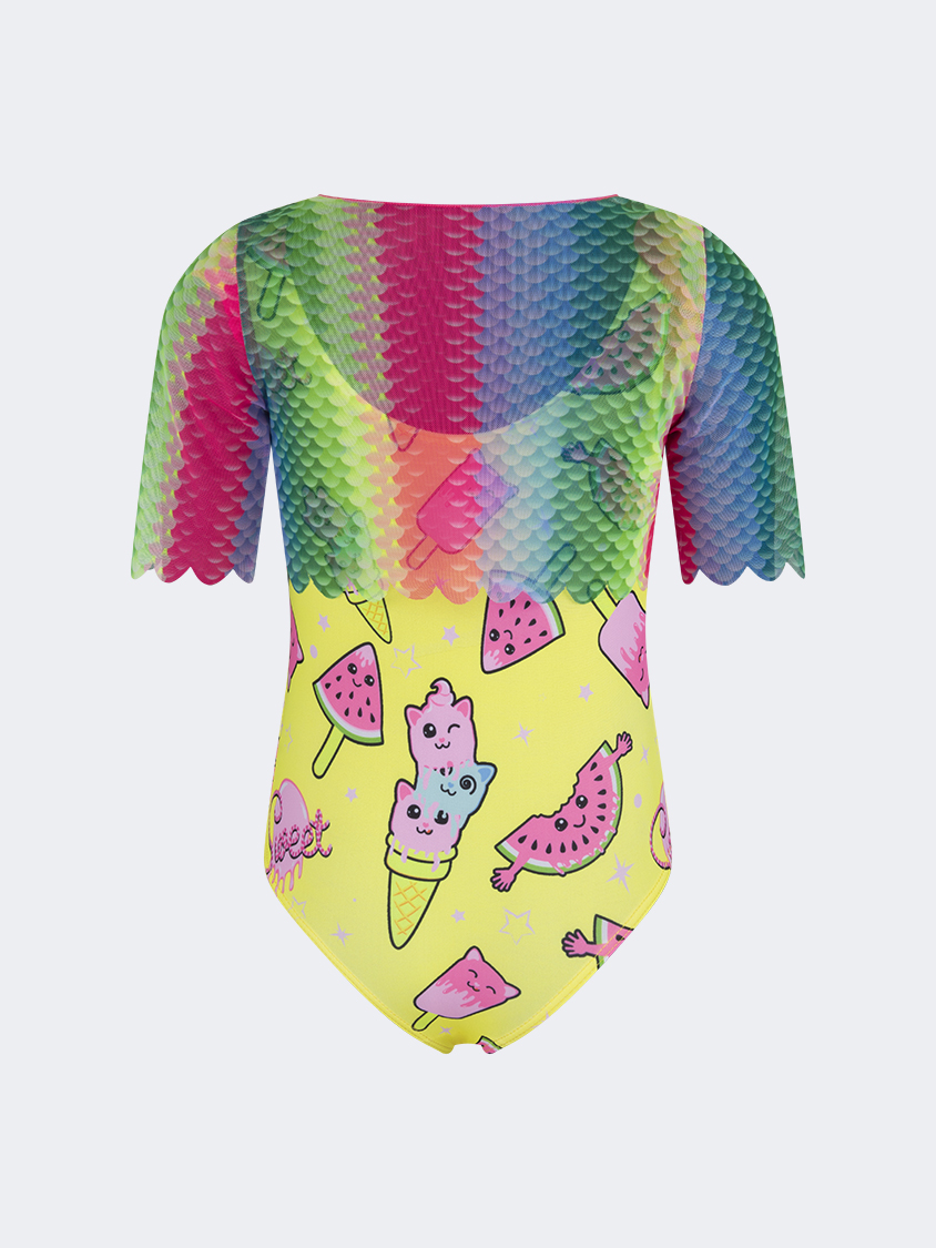 ?Vibrant sunshine-yellow body with multicolor swirl panels at side cut-outs