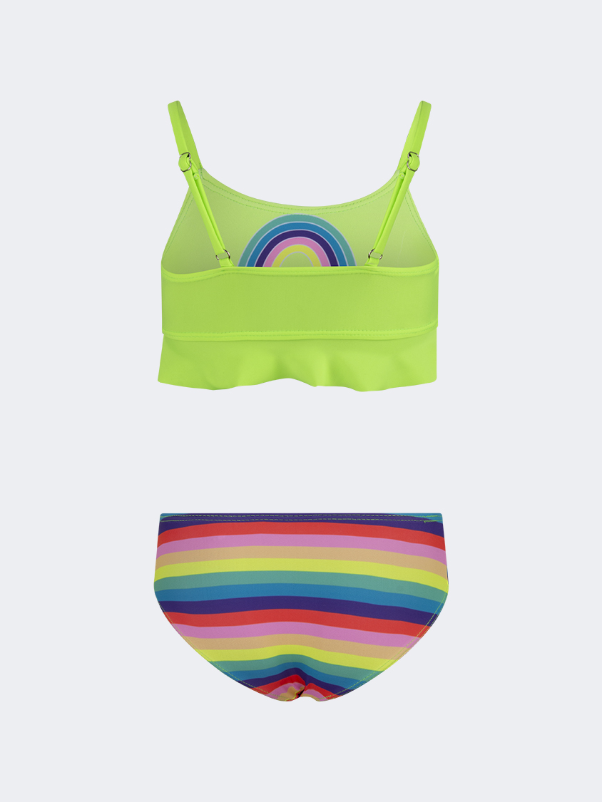 A playful two-piece bikini crafted for carefree beach days. The triangle top has soft, removable cups and fully adjustable cross-back ties, so it flexes as she grows. Hipster bottoms feature gentle ruched side tabs that sit smoothly and never pinch. Both pieces use a silky four-way-stretch swim jersey that dries in minutes and bounces back after every dip.