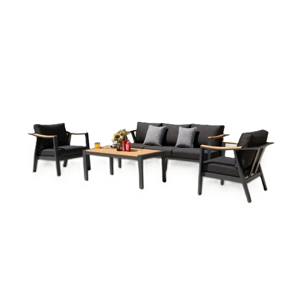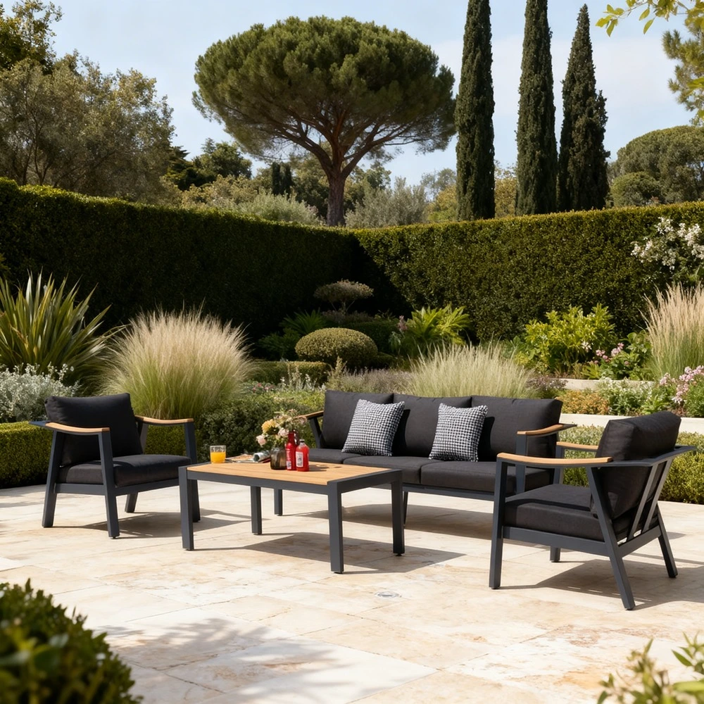 Black outdoor sofa set with aluminium and teak wood frame, three-seater, two chairs and a table.