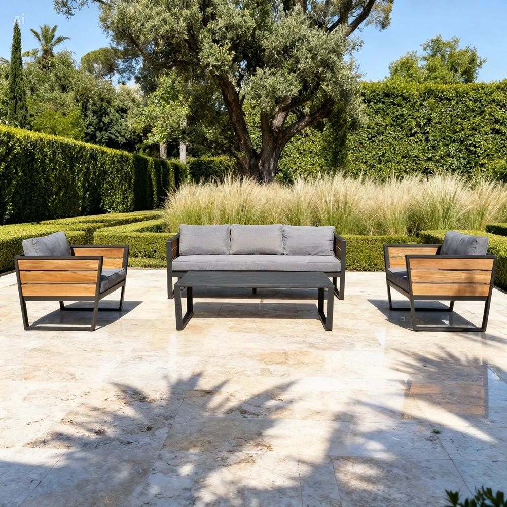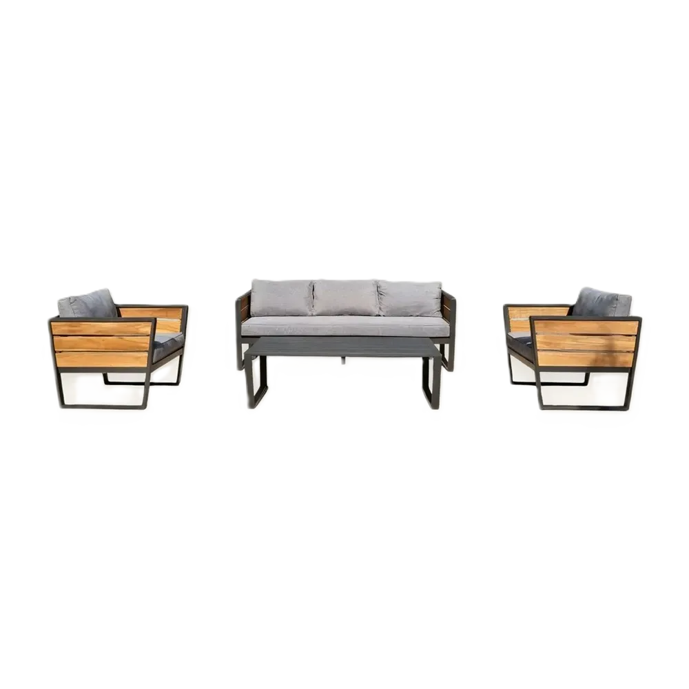 Grey outdoor sofa set with wood and aluminium frame, three-seater, two chairs and a table.