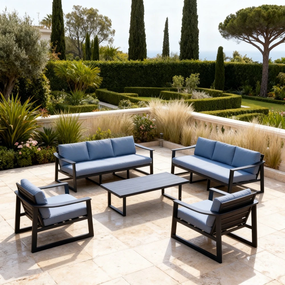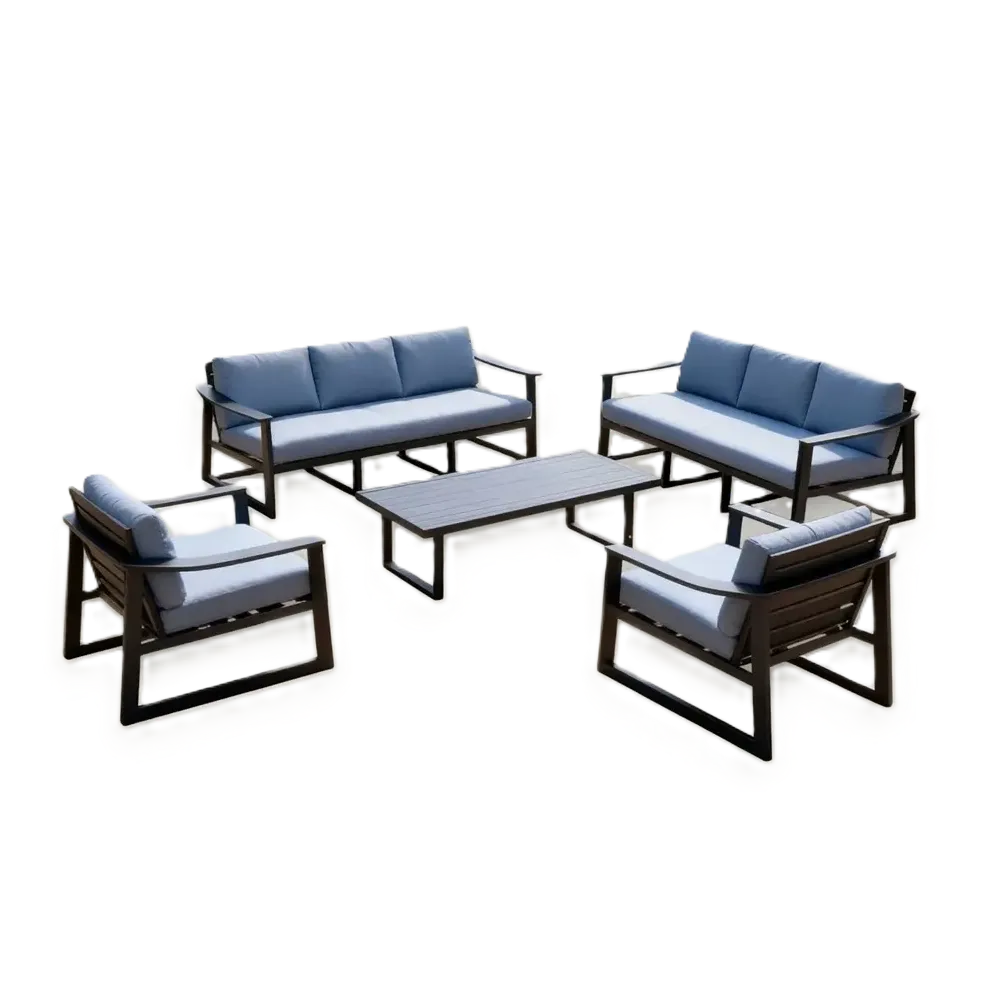 Grey outdoor sofa set with aluminium frame, two three-seaters, two chairs and a table.