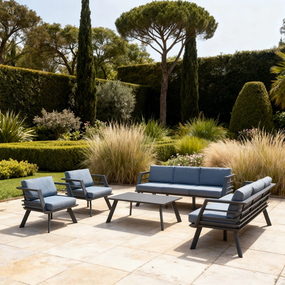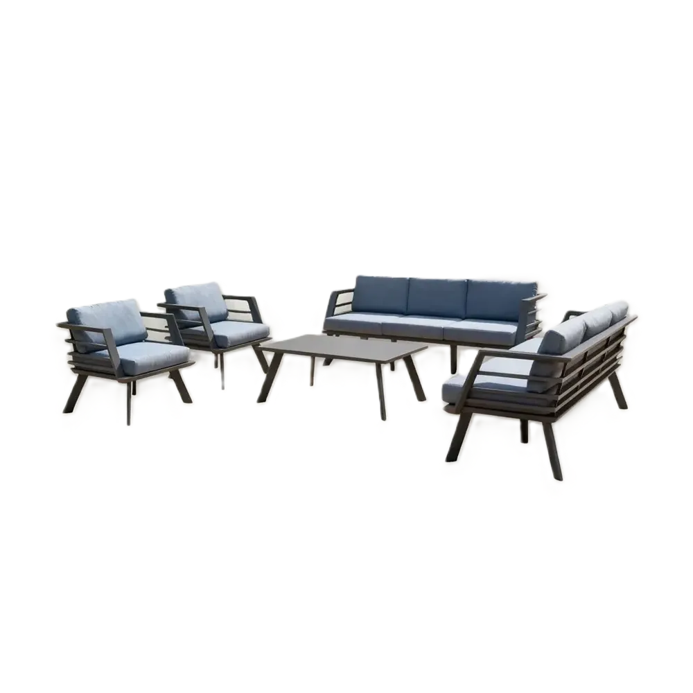 Grey outdoor sofa set with aluminium frame, two three-seaters, two chairs and a table.
