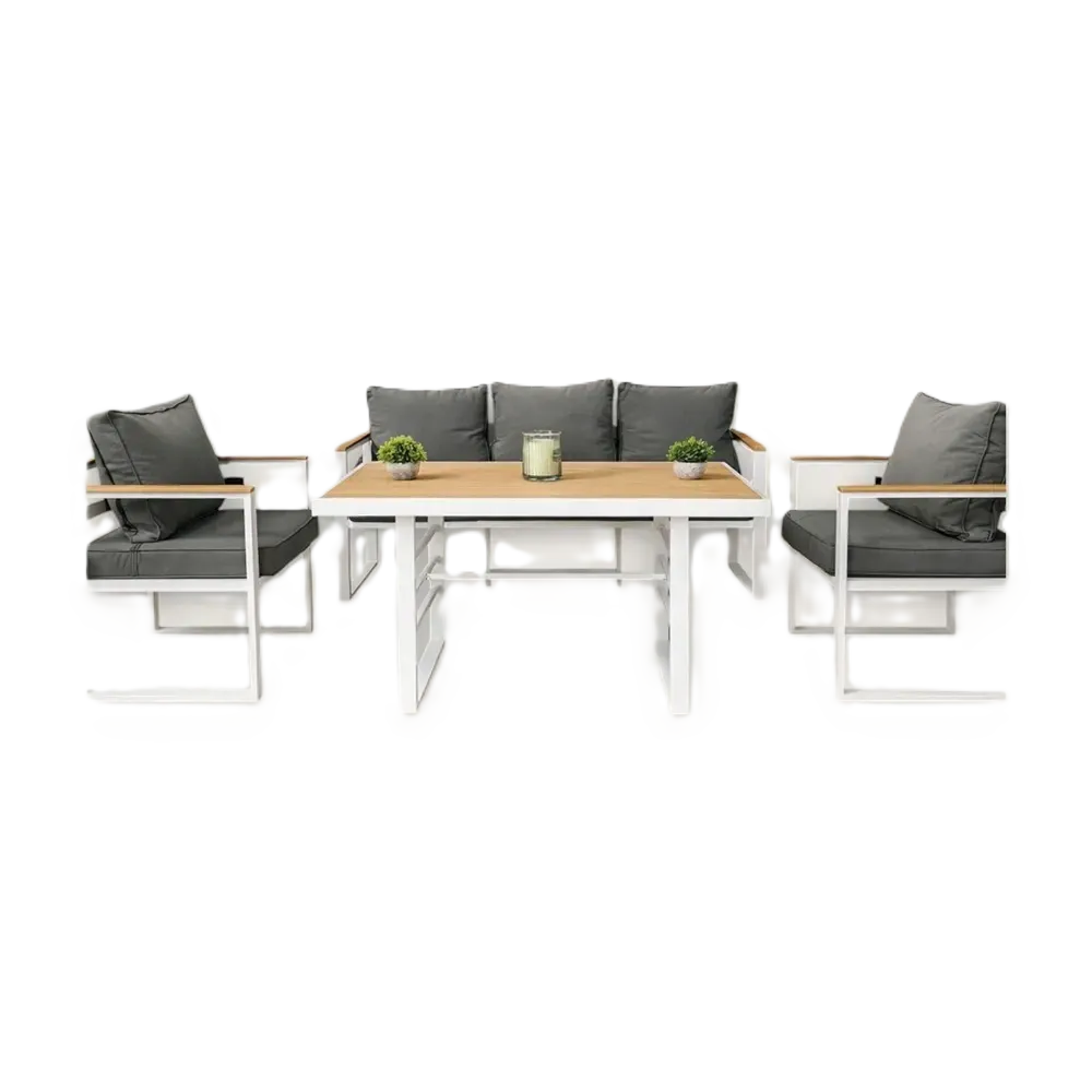 White outdoor sofa set with polywood and steel frame, three-seater, two chairs and a table.