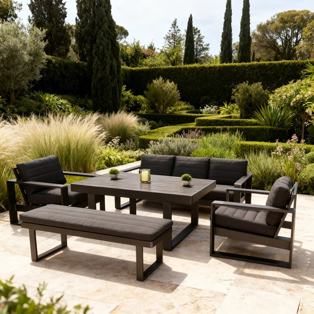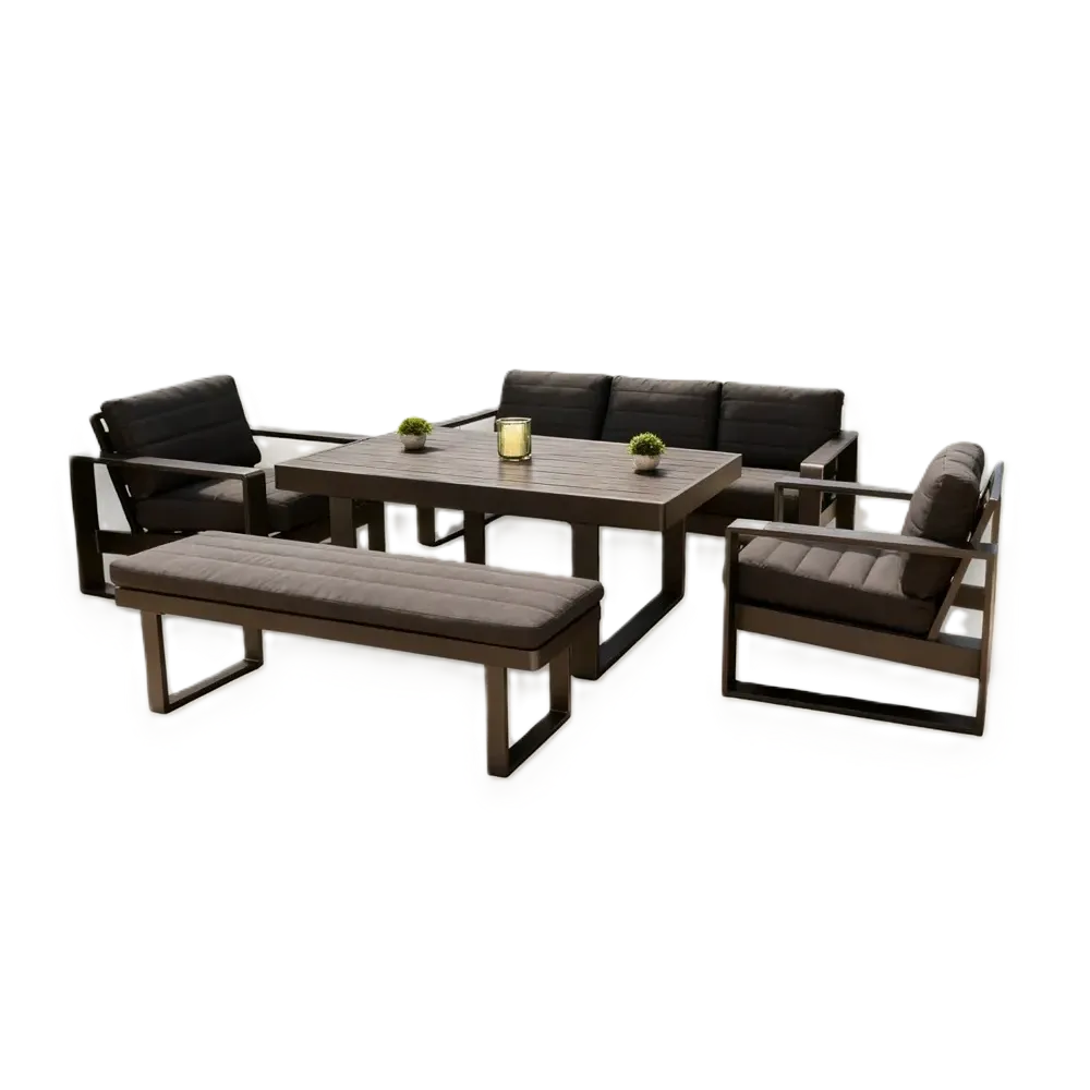 Grey outdoor sofa set with aluminium and polywood frame, three-seater, two chairs, bench and table.