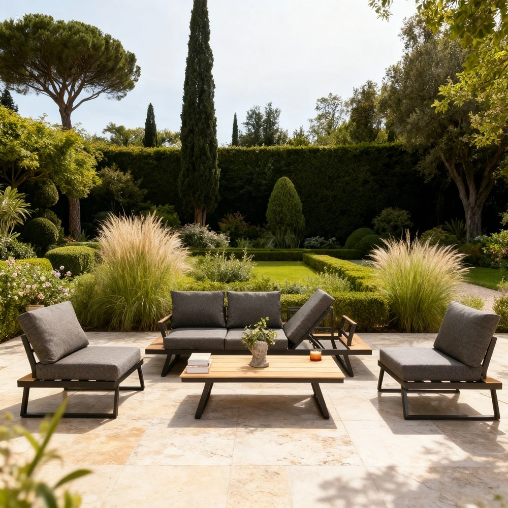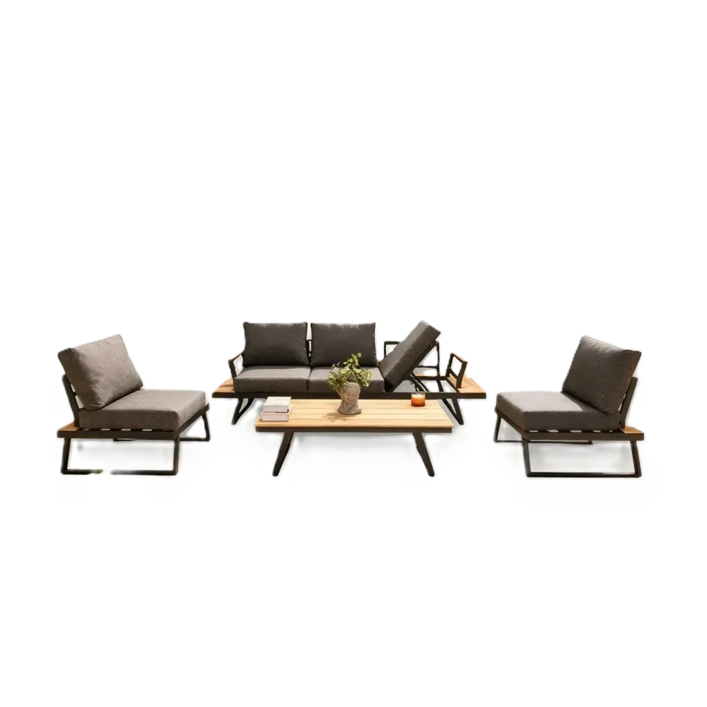 Grey outdoor sofa set with aluminium and teak wood frame, three-seater, two chairs and a table.