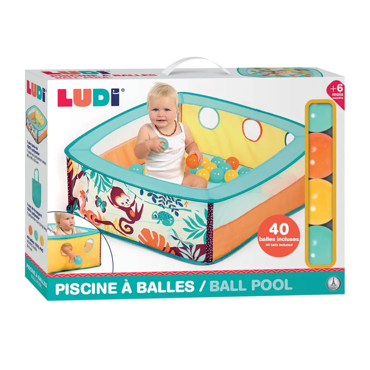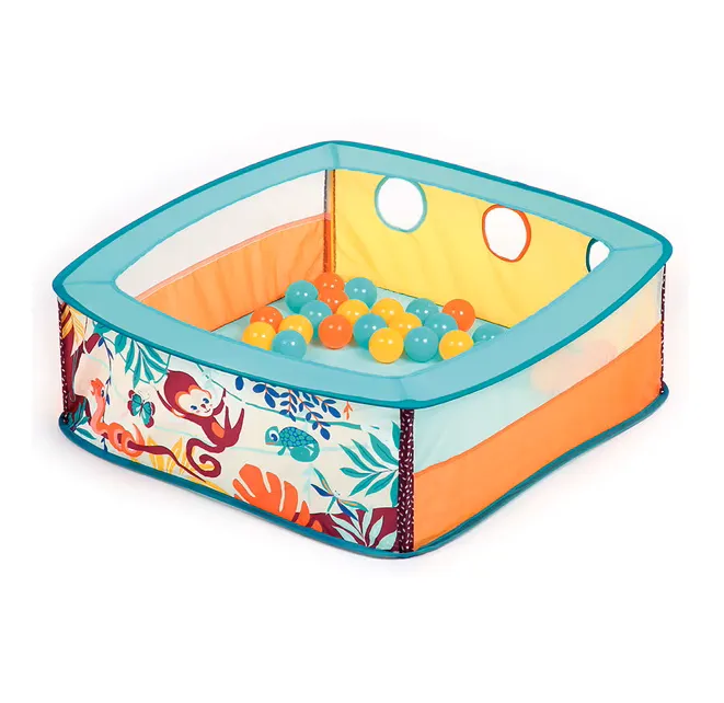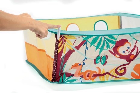 Ready in two easy steps - The ball pit with its pretty jungle theme, delimits a space for baby who can play with the 40 colorful balls and his favorite toys and pass the balls and his little hands through the 3 holes - Nomadic, this ball pit can be transported everywhere. Its pop-up structure and the 4 tubes, light and flexible, are very easy to install or fold. In the blink of an eye, you can easily store it in its carrying bag to enjoy holidays or weekends with the family with baby. At home, you can leave it folded and slide it behind a piece of furniture - Applied as an independent play area, the flexible structure will allow the "older ones" to get in and out easily. For toddlers who can crawl, we recommend parental supervision as the soft walls will not hold them in - Suitable for children over 6 months - Dimensions: 80 x 80 x 30 cm - Number of balls: 40 (6 cm diameter) - Easy to clean with a damp cloth. Age requirement: from 6 months Item dimensions: L80 x W80 x H30 cm