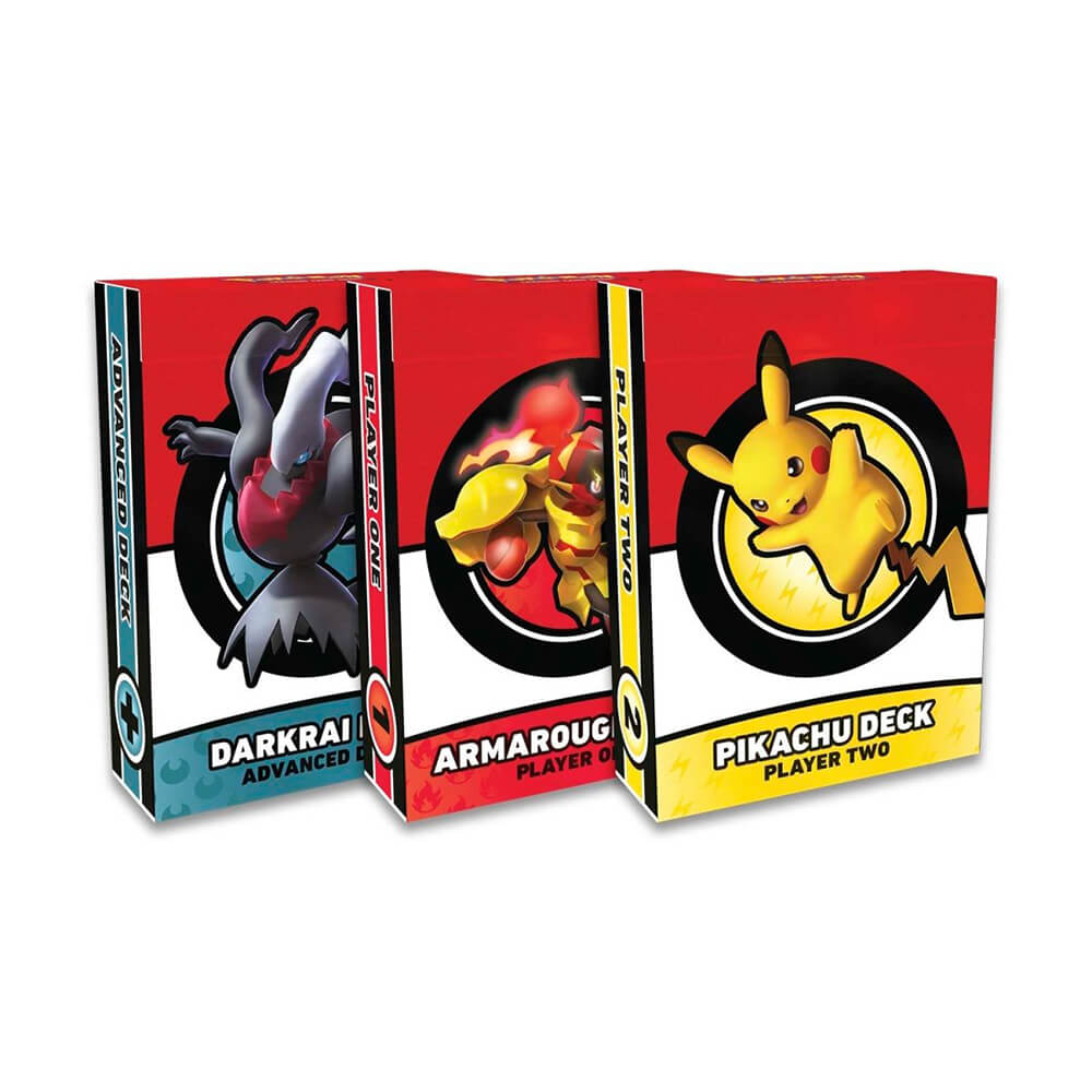 - Gameplay Accessories: 1 set of damage counters / 1 large metallic coin featuring Armarouge, Pikachu, and Darkrai / 1 two-player game board / 1 rulebook