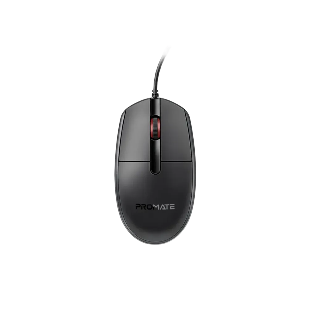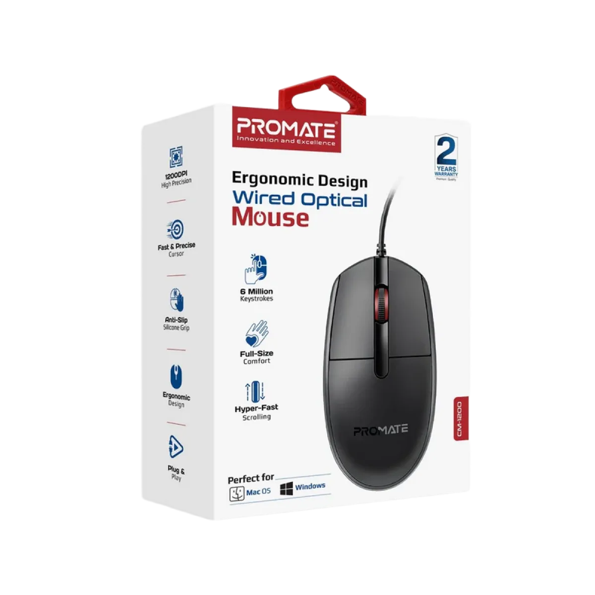 Promate (CM-1200) Ergonomic Wired Mouse, 1200 DPI, USB - Black Optical Mouse, Ergonomic Design, Full-size Comfort, Hyper-fast & Precise Cursor, Anti-slip 6M Keystrokes, 1200 DPI USB Interface, 1.5m Cable Length