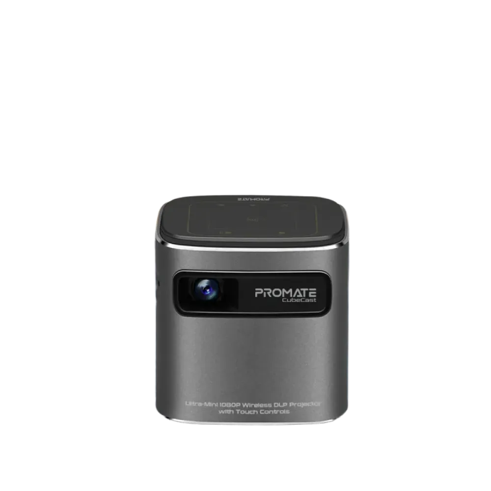 Promate (Cubecast) Wireless DLP Projector - 70ANSI Lumens - Grey Bluetooth Version: BT5.0 Wireless Frequency: 2.4Ghz/5Ghz Input Rating: 5V/3A Display Technology: DLP (0.2"DMD) Supported Resolution: 1080P@60Hz Brightness: 70 ANSI Projection Ratio: 1.4:1 Contrast Ratio: 1000:1 Battery Capacity: 3300mAh, Lithium-ion battery Playtime: Up to 1.5hrs USB Drive Max Capacity: 32Gb HDD Max Capacity: 1Tb Operating System: Android 7.1 2 Years Official Warranty