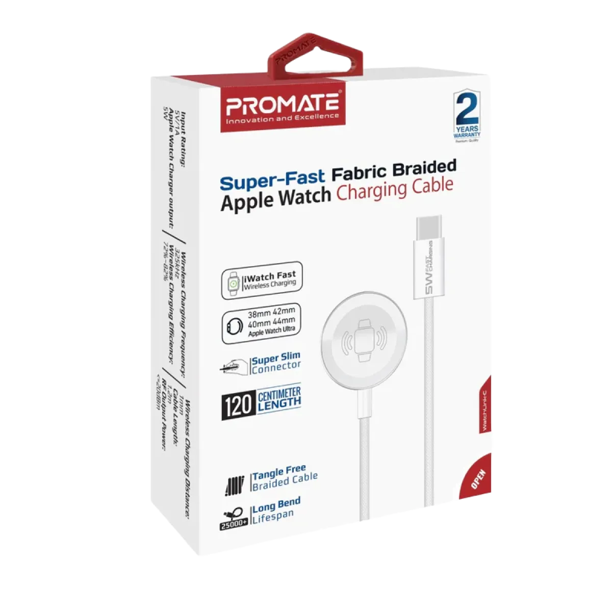 Promate ( WatchLink-C ) Charging Cable for Apple Watch Super Fast Fabric Braider- Long Bend- White