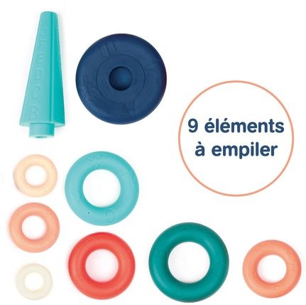 This pretty pyramid will entertain babies and adults alike! This stacking and balancing game is made up of 8 colorful rings and 1 central rod. Made of thick, flexible plastic in bright colors, the pyramid attracts curiosity. The rings are lightweight, making them easy for little ones to hold. Children can put them in their mouths; the material is easily resistant to small teeth and can be easily washed with a damp cloth. The 8 rings stack in order of size. By manipulating them, children discover and compare objects. They establish their own sensory experience at their own pace before understanding how to fit them in order. The central rod is cone-shaped. This feature guides children to classify the rings from largest to smallest so they can stack everything. Logic is called upon! The different sizes give babies their first notions of size and develop their memory. By manipulating the rings, children will discover patterns engraved all around them: letters, animals, numbers, shapes. These patterns are also found on the central cone. As children grow up, they can have fun aligning the patterns with their twins. This requires concentration and precision! The pyramid gradually awakens children's fine motor skills and visual acuity. Suitable for children over 12 months. Pyramid dimensions: 12 x 17.5 x 12 cm - Composition: 100% PVC. Washable with a damp cloth.