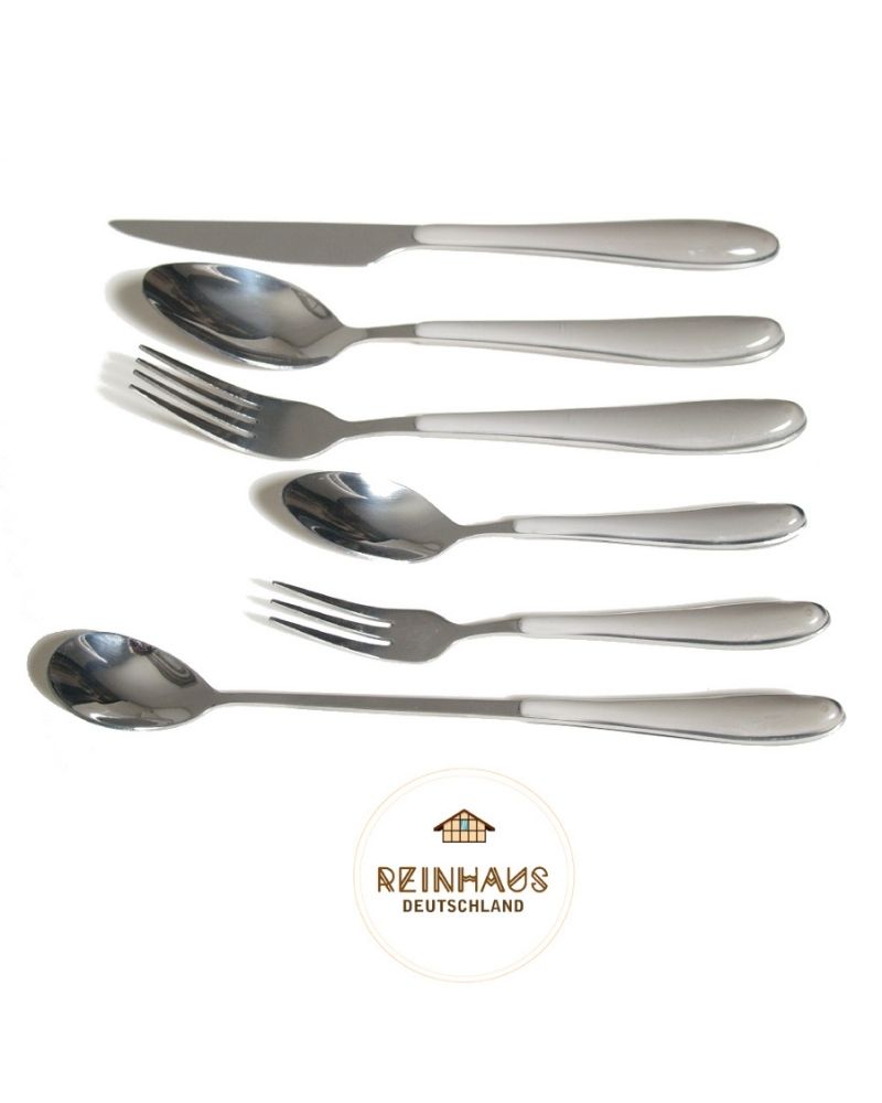 Reinhaus Flatware / Cutlery / Stainless Steel Diamond White Set 36 Pieces Composition: 6pc Dinner Fork (19.5x2.3cm - 35g) 6pc Dinner Knife (22.8cm - 33.5g) 6pc Dinner Spoon (19.9x3.9cm - 45g) 6pc Ice Spoon (20x2.6cm - 23g) 6pc Small Fork (11.4x1cm - 16g) 6pc Tea Spoon (14.2x2.8cm - 22.5g) -Elegant Diamond Design White Color -All item is made of Stainless Steel, the upper handle is coveWHITE with White color plastic -Functional and easy to wash and handle -Durable and Rust Resistant -Stainless Steel 420 -Dimensions: 22.8cm -Weight 33.5g -3pcs bag