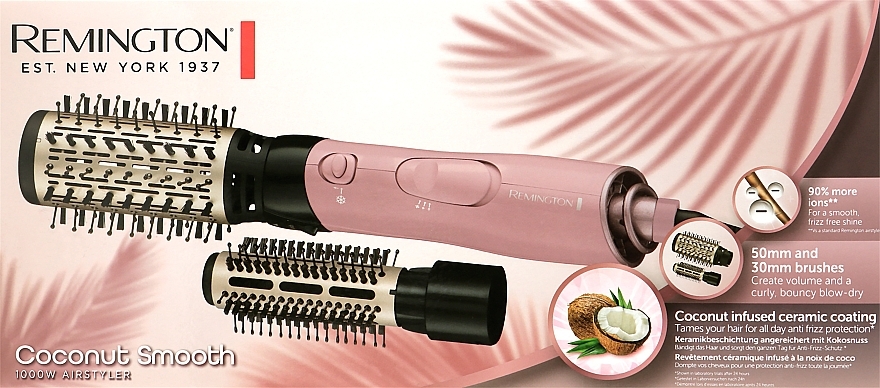 Advanced Ceramic Coated Barrels with Coconut infused micro conditioners Ionic Conditioning with 90% More Ions** Powerful 1000W 30mm Round Brush 50mm Round Brush Mixed Bristles 2 Heat/Speed Settings Cool Shot Removable Easy Clean Grille Swivel Cord