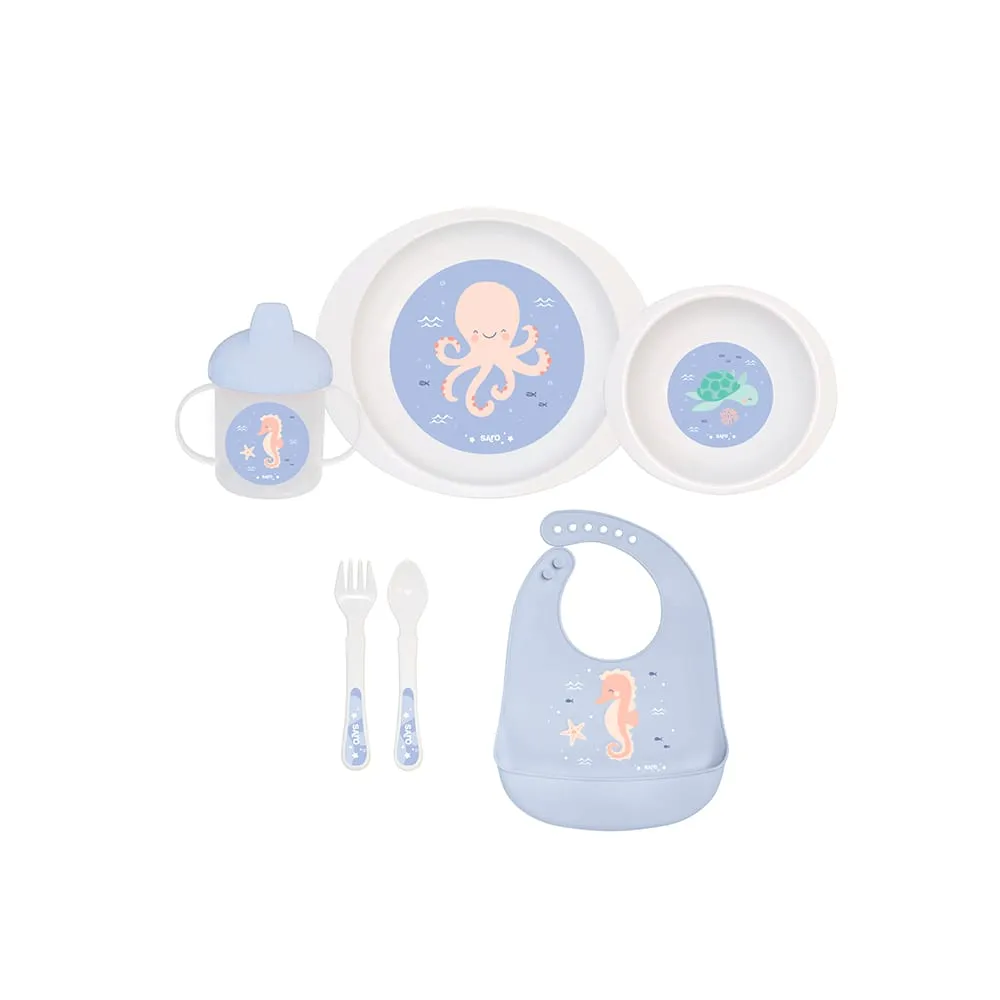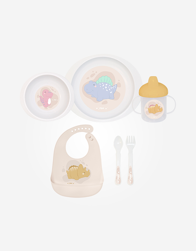 Complete feeding set to make lunch time a great experience. child. It awakens the child’s natural curiosity to do things like grown-ups._x000D_\n_x000D_\n• It includes: plate, bowl, two-handled antileak tumbler, silicone bib, spoon and fork._x000D_\n• Perfect flexible and comfortable silicone bib, to protect the baby clothes during mealtimes. Has a practical pelican bib and adjustable collar fitting. Easily and quickly washable._x000D_\n• Bisphenol-A free._x000D_\nIn conformity with UNE-EN 14372, EN14350 and EU 1245/2020.