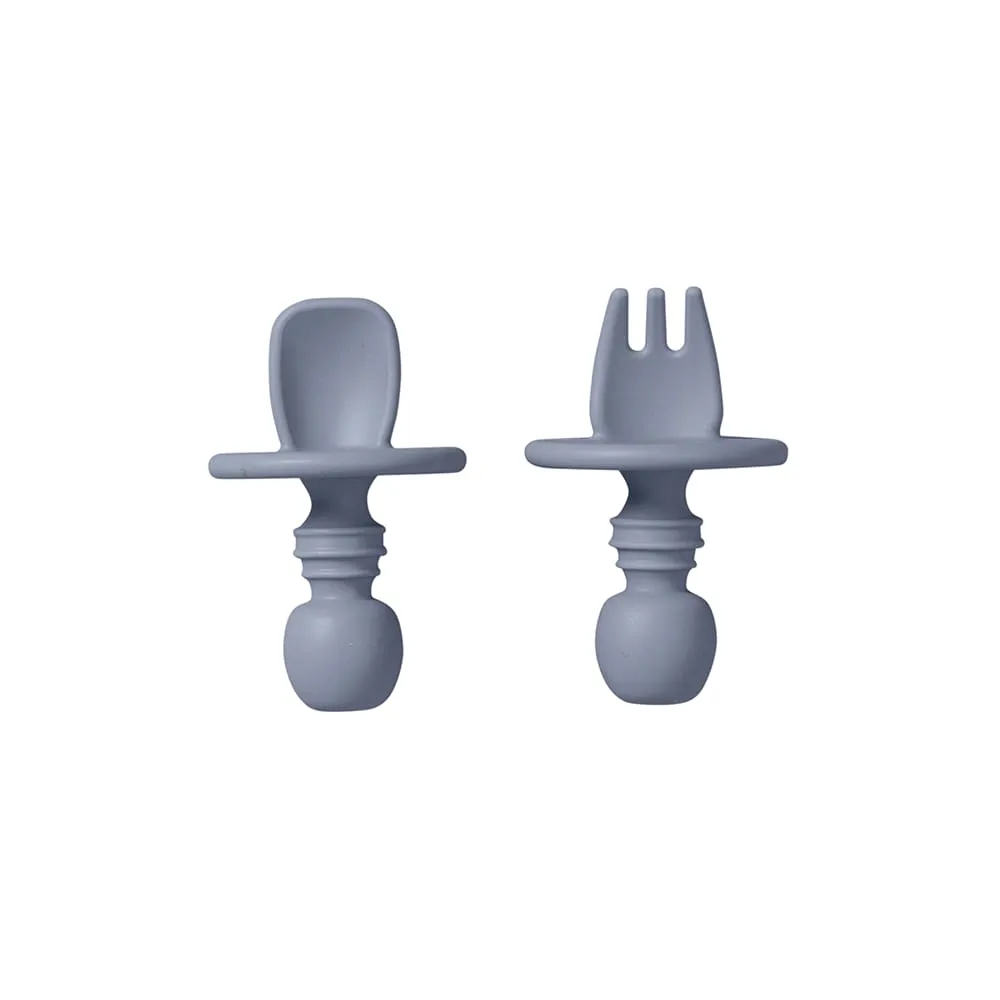 Set of spoon and fork with ergonomic design Specially designed so they are easy to grip for little hands. It adapts to his needs to catch food the simplest way. Its silicone handle is very soft and provides a firm grip._x000D_\nThe curved shovel-shaped design helps to catch food easily, preventing food from falling off._x000D_\nThe built-in silicone ring prevents cutlery from causing choking. 100% safe!_x000D_\nKids will gain confidence and enjoy their learning._x000D_\nmaterial with numerous advantages:_x000D_\nantibacterial and extremely resistant: it does not deform, as it is very flexible. It withstands extreme temperatures without losing its properties. It’s pretty much unbreakable!_x000D_\nMade of food silicone, an eco-friendly_x000D_\nDishwasher safe. Non suitable for microwave. Wash with soap and water before first use. Do not use abrasive cleaning products. Do not boil to sterilise. For your child’s safety and health, Warning!_x000D_\nIn conformity with norm UNE-EN14372 y EU10/2011