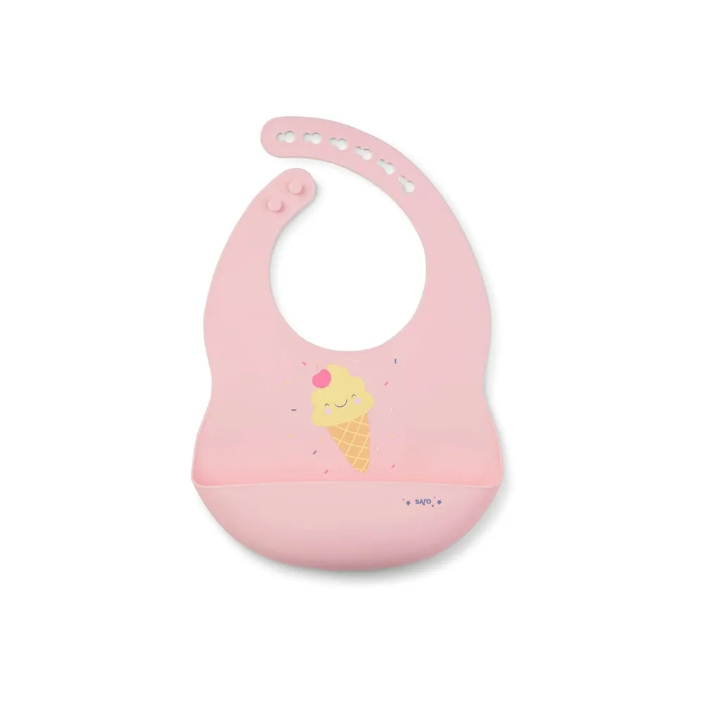 Perfect flexible and comfortable silicone bib, to protect the baby clothes during mealtimes. Has a practical pelican bib and adjustable collar fitting. Easily and quickly washable.