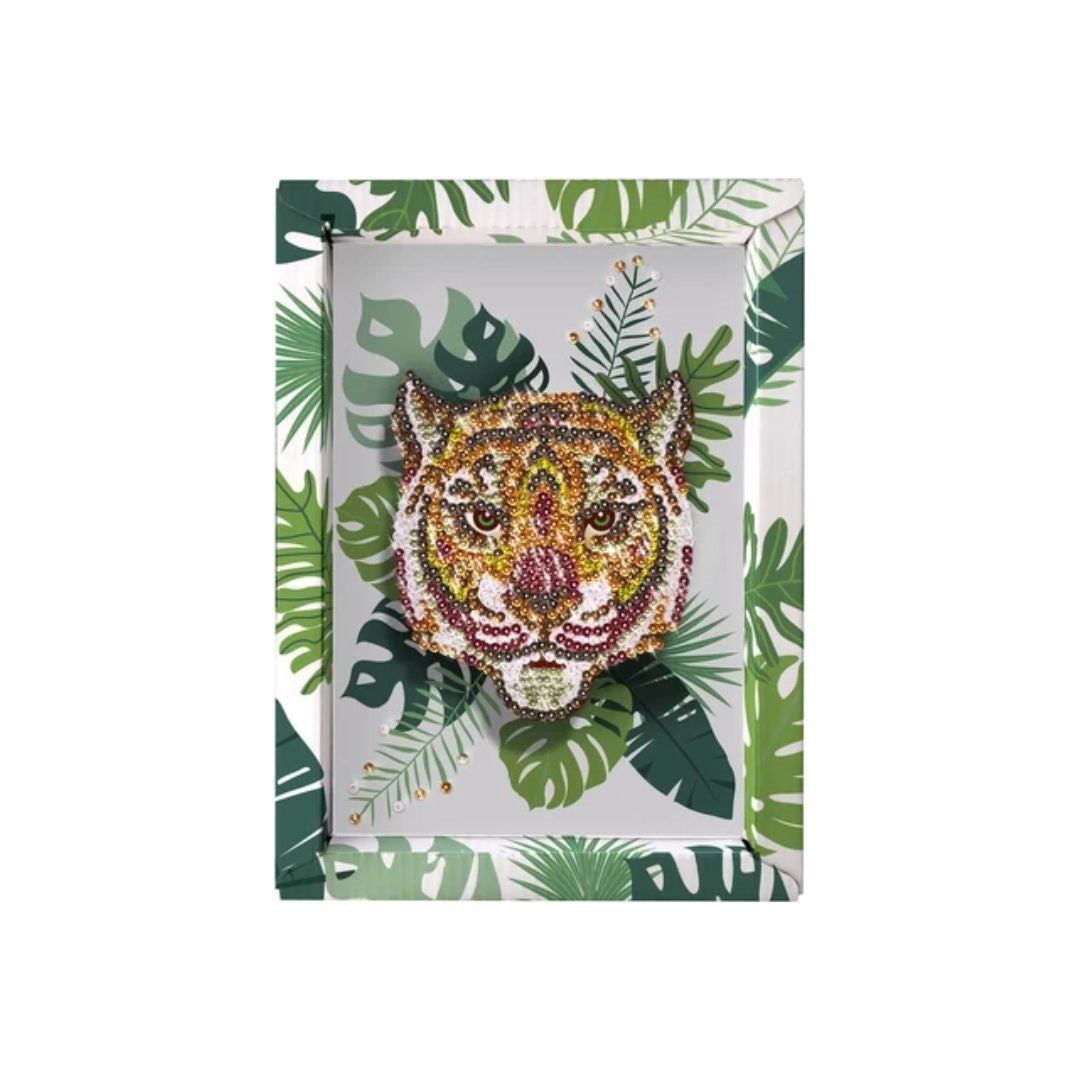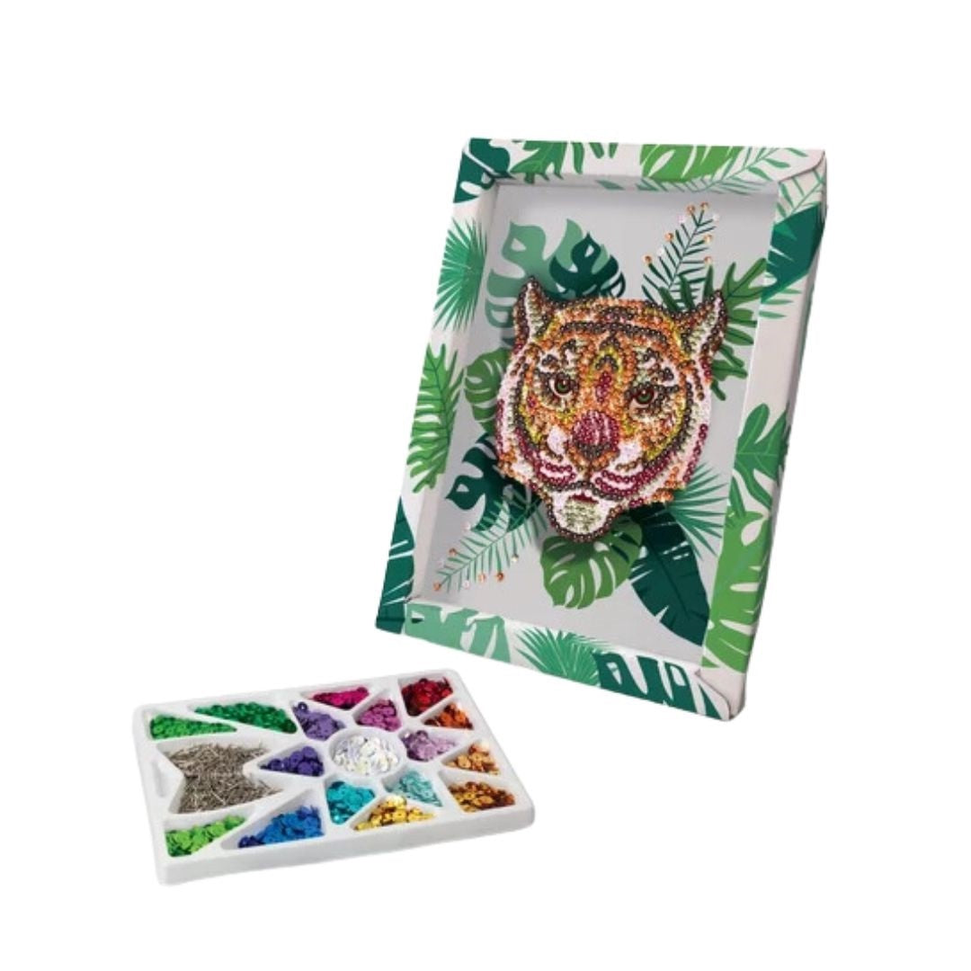The Sequins Collection Tiger Creative Toy is a sparkling glitter painting set designed for children. It features a vibrant illustration of a tiger in a lush setting, allowing young artists to create their masterpiece with ease.آ