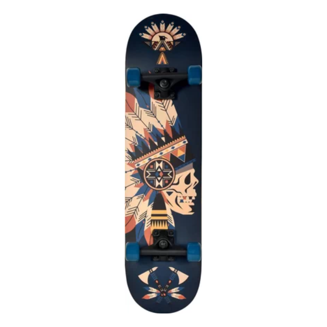 Skateboard Awaii de 31 pouces design Indian Skull 2. Planche 8 plis en أ©rable, double kick, grip antidأ©rapant noir imprimأ© photo print mat, qualitأ© 80AB. Truck nylon, 5'' PP noir.