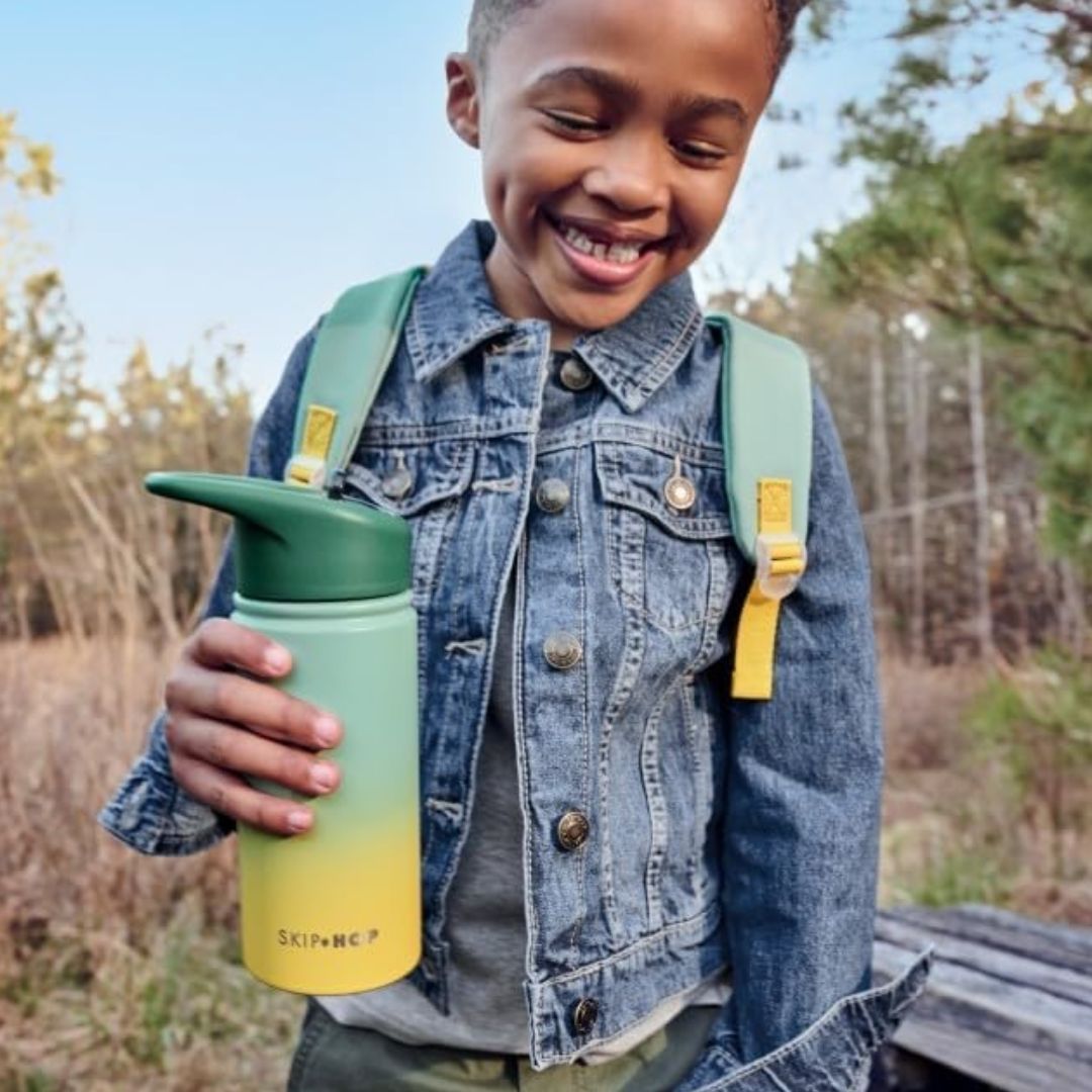 The Skip Hop Insulated Stainless Steel Kids Water Bottle with Straw in Wander Ombrأ© Green is designed for active children, ensuring they stay hydrated during various activities.