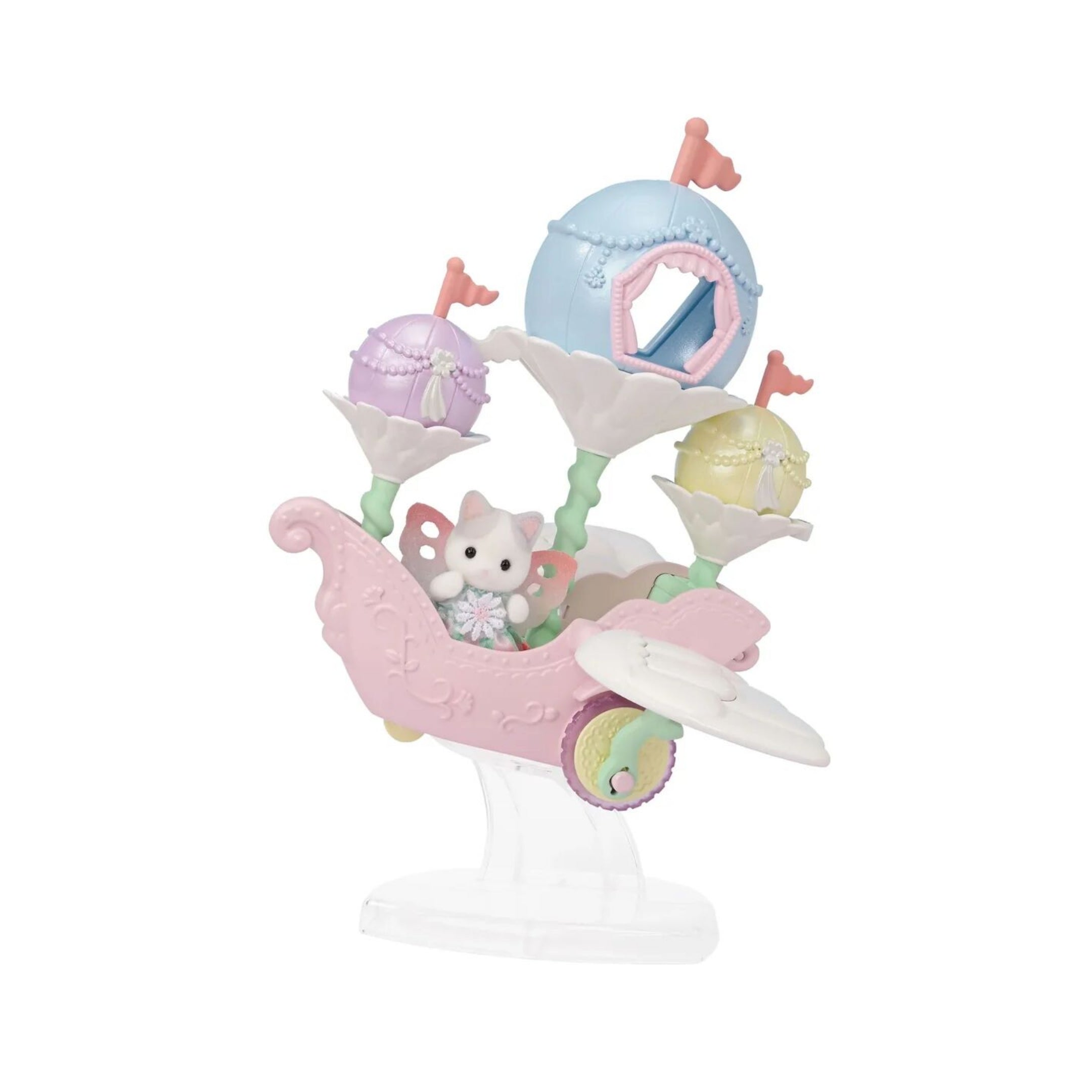 The Epoch Nursery Sandbox and Pool Playset is a favorite gathering spot for Sylvanian Families nursery children, designed to inspire imaginative outdoor-style play. A bright, colorful staircase leads up to the charming castle tower, while a large window offers a clear view over the pool and sandbox area, creating an open and playful setting.