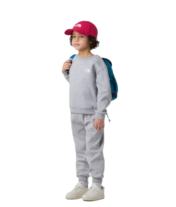 Two-piece fleece set: includes a pullover top with a dome or logo design and matching pants with an elastic waist for ease
